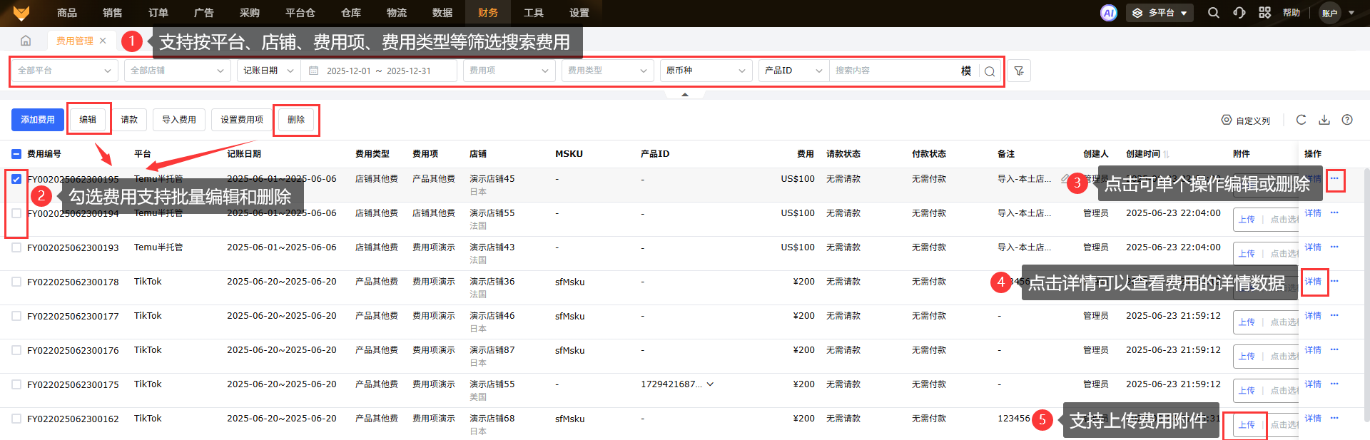 ①导入模板支持导入不同平台店铺费用;