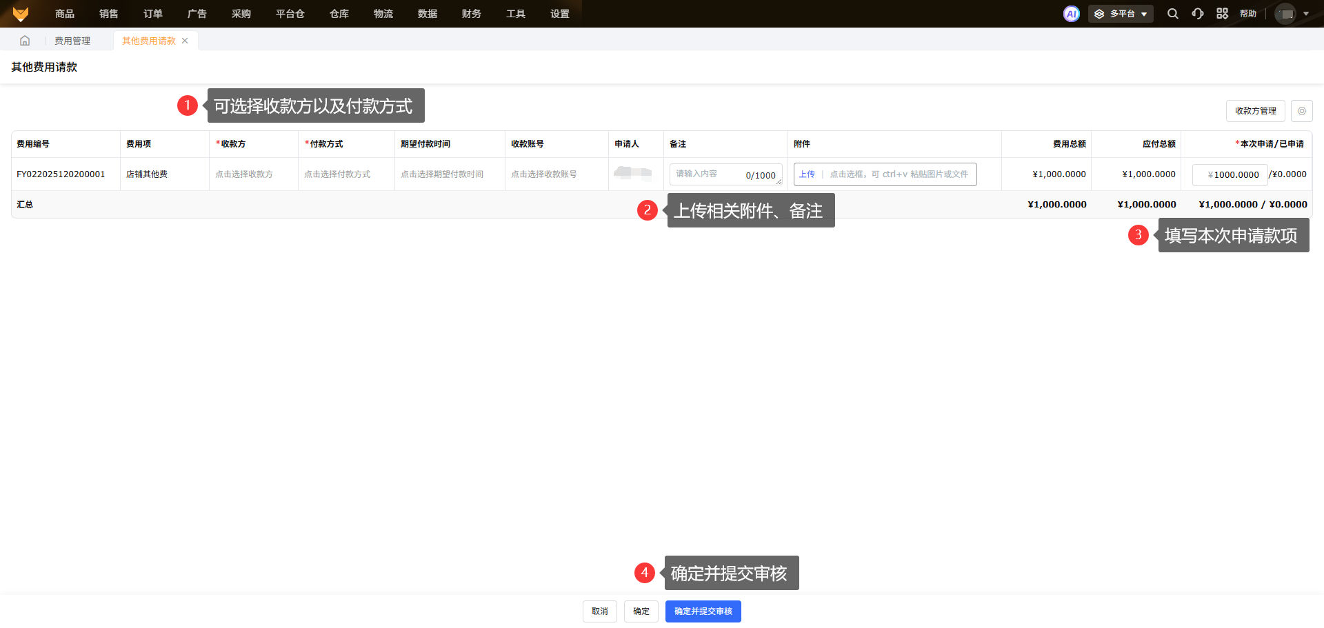 ①费用类型目前只支持店铺其他费和产品其他费