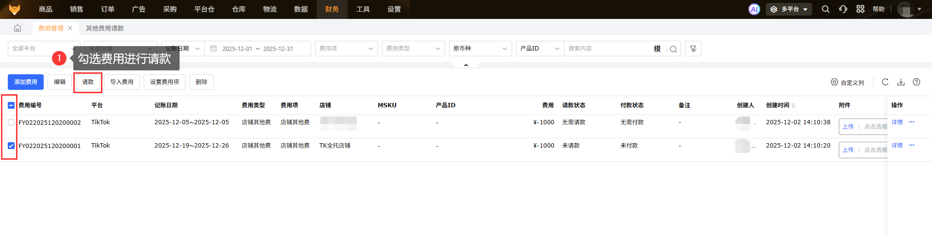 支持筛选站点、店铺、日期、费用项等查看数据,店铺其他费/产品其他费都允许多选,在搜索店铺或者产品时,只要该费用中有选择到该店铺或者该产品即可搜索出来;