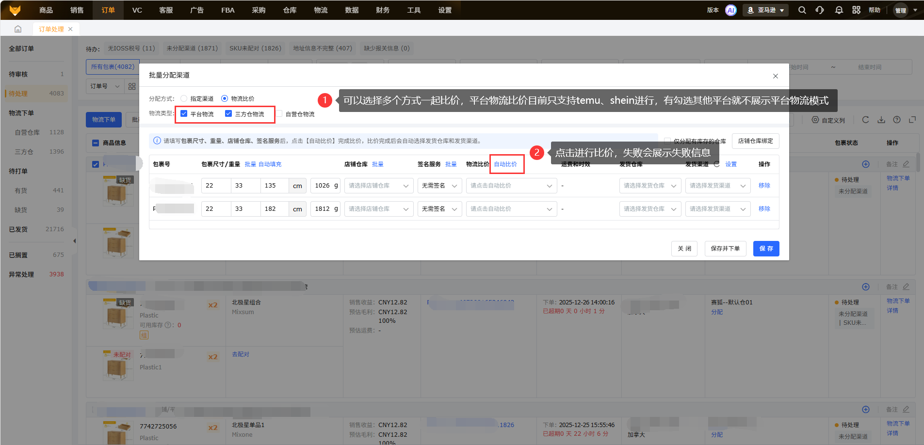 ②批量包裹比价(目前只有Temu、Shein支持平台物流比价)