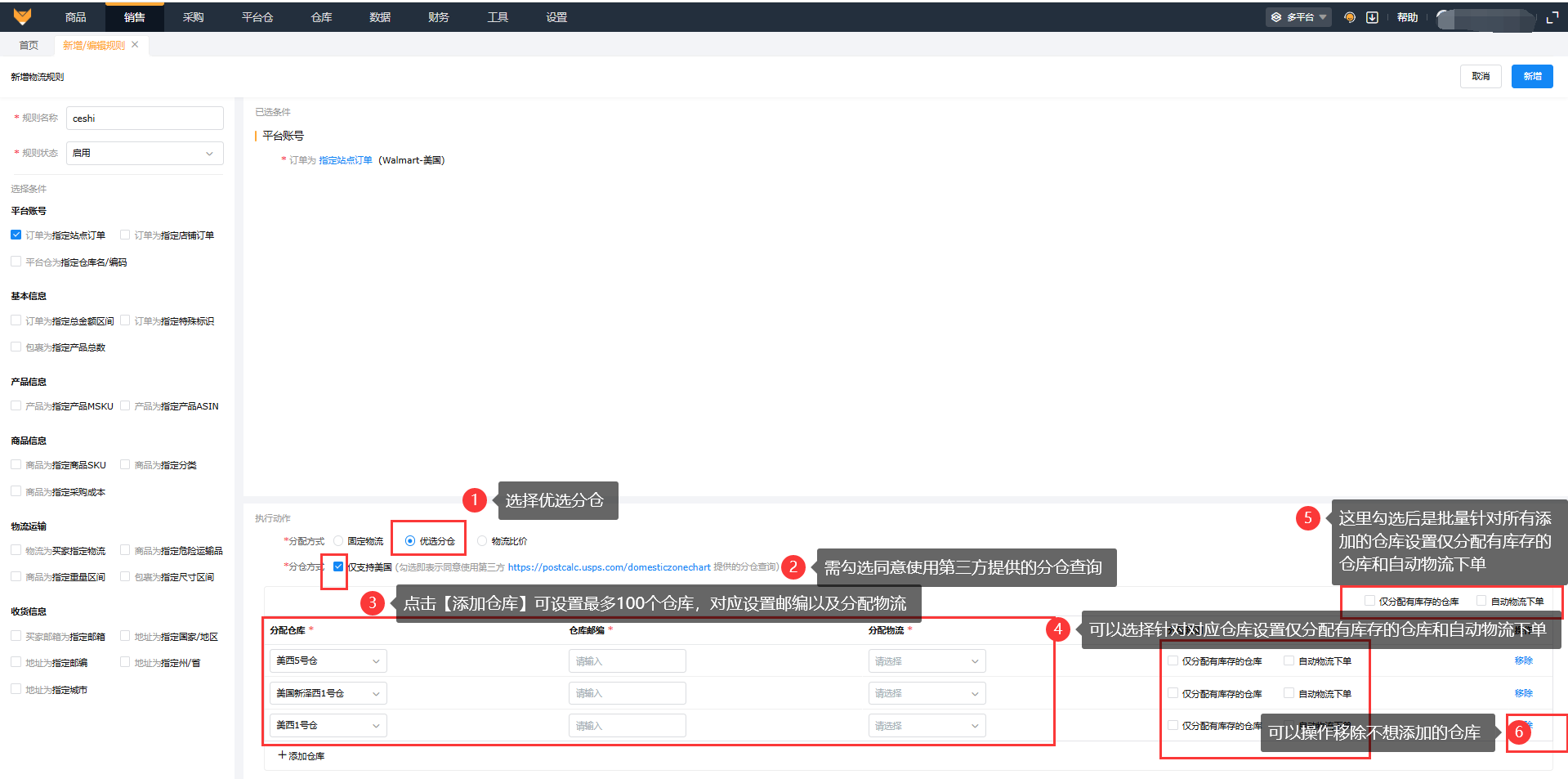 ①目前仅支持发往美国的包裹使用优选分仓;②添加仓库最多支持添加100个;