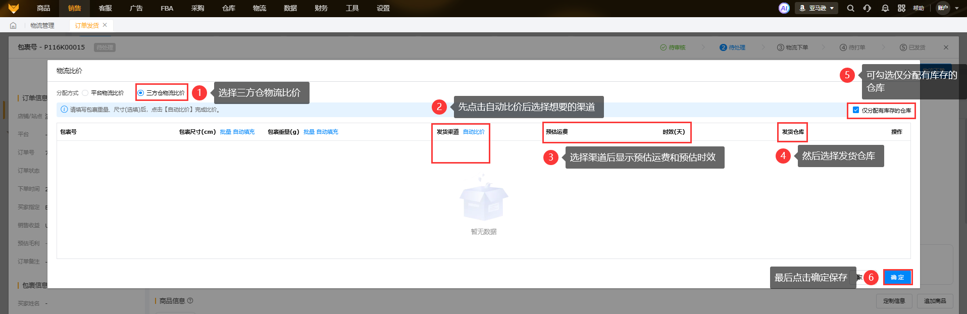 分配物流这里只显示在物流设置里开启了的物流渠道,如果现实无数据,需要到物流设置页面对应开启渠道。
