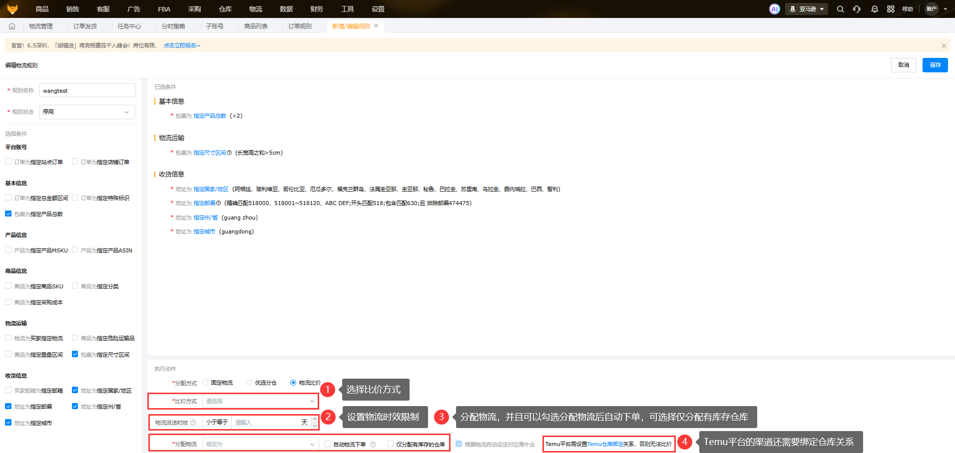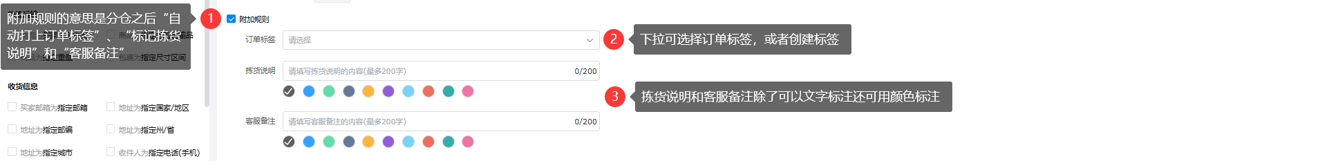 ⑦附加规则:分仓后可自动打上订单标签或者拣货说明、客服备注;