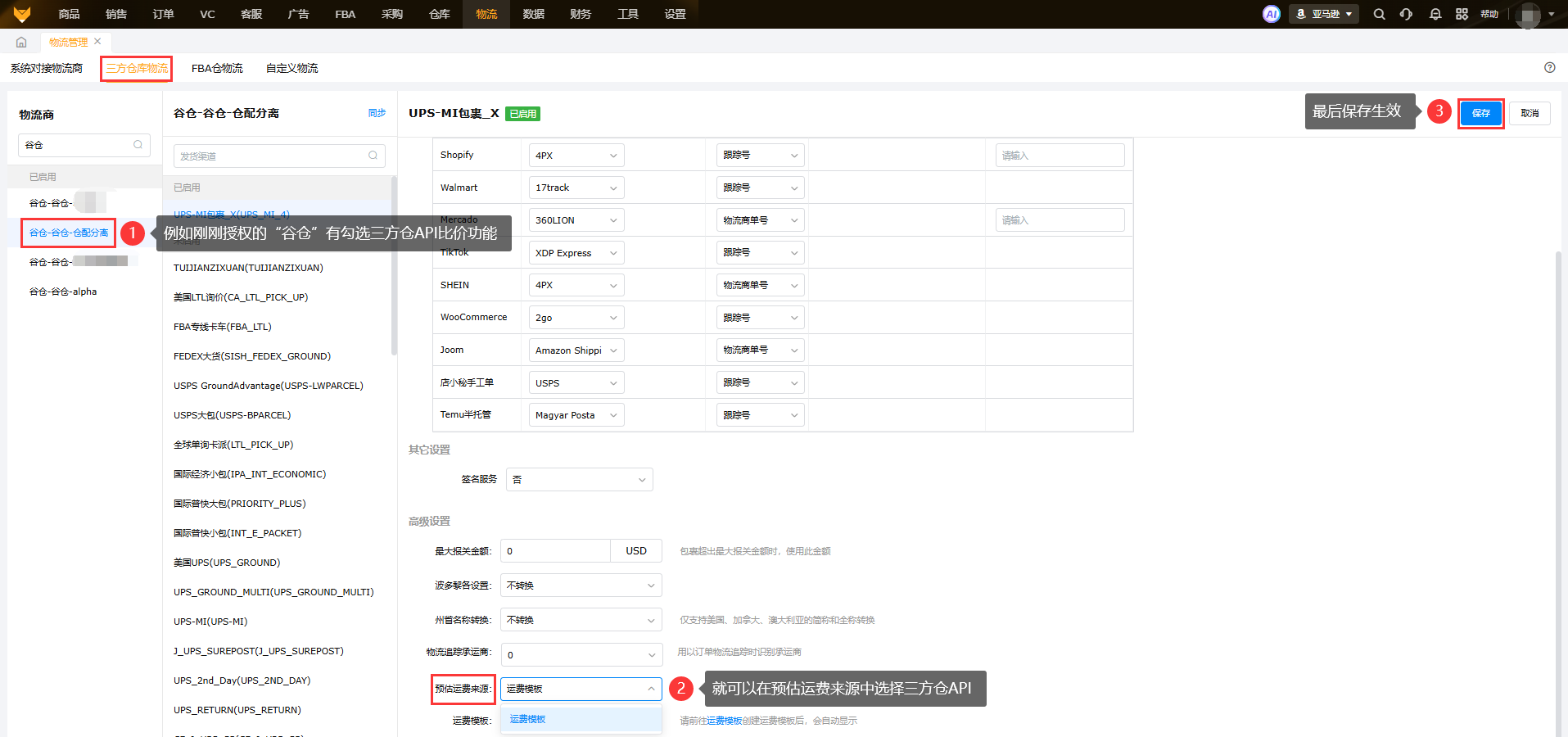 ③仓库邮编:根据仓库所在地编辑仓库邮编,系统根据包裹地址自动匹配距离哪个仓库更近,优先分配;