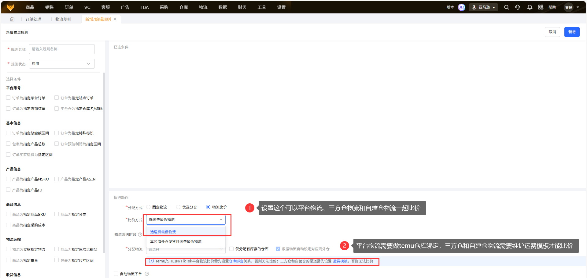 ③选运费最低物流(海外仓):指按照设置的海外仓运费模板对比海外仓渠道的运费,支持系统对接的物流商和自定义物流;