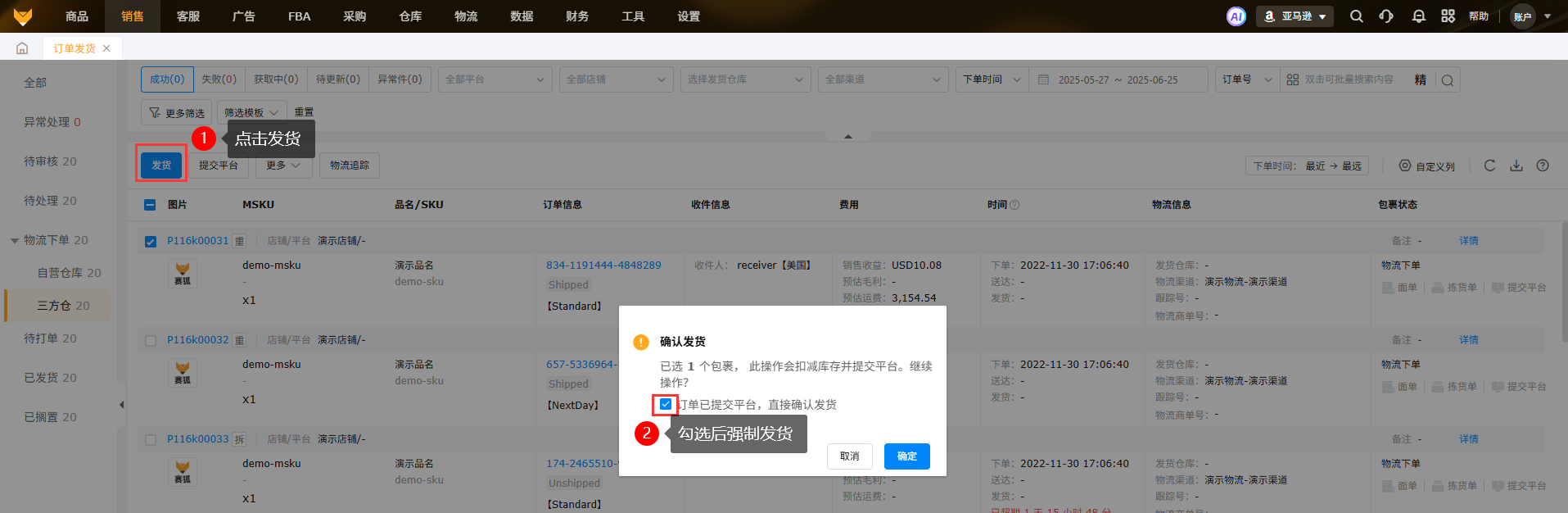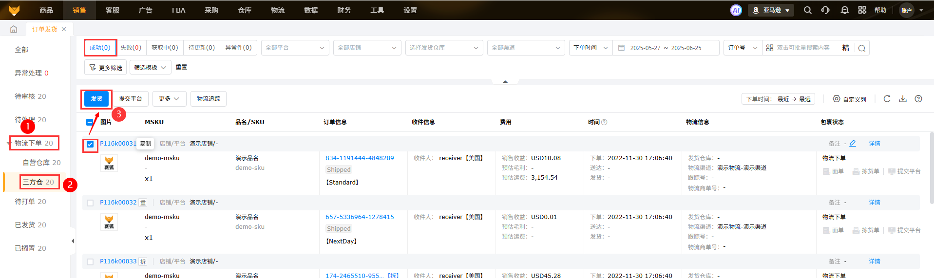 【物流下单-三方仓-“成功”点击发货】