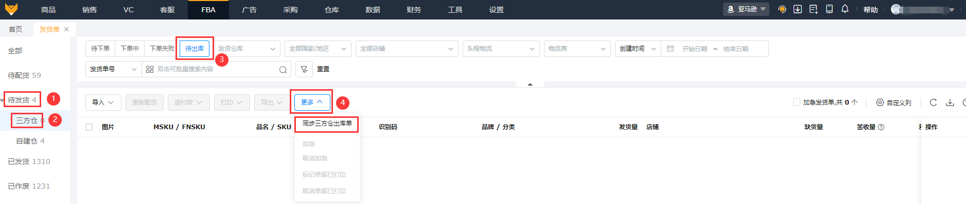 【待发货-三方仓-待出库-更多“同步三方仓出库单”】若更新较慢,可以点击同步,也会自动转到已发货。