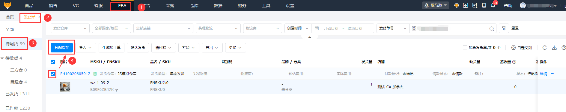 【FBA-发货单-待配货-分配库存】发货仓库:系统自建海外仓需要有库存。