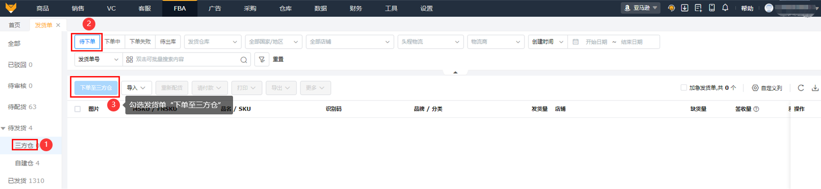 注意:发货仓选择三方仓,只有部分三方仓支持“下单至三方仓”出库,若选择不了就不支持,需要到三方仓去下单发往FBA仓。