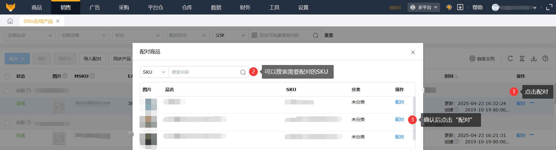 选择未配对的产品,在操作列点击【配对】,搜索本地商品的SKU。