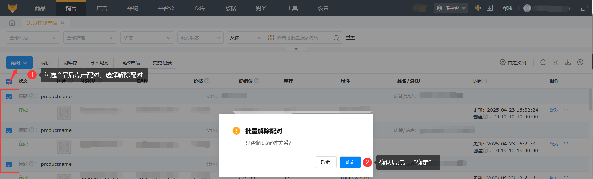 选择产品进行解除配对,解除在线产品与本地商品的配对关系。