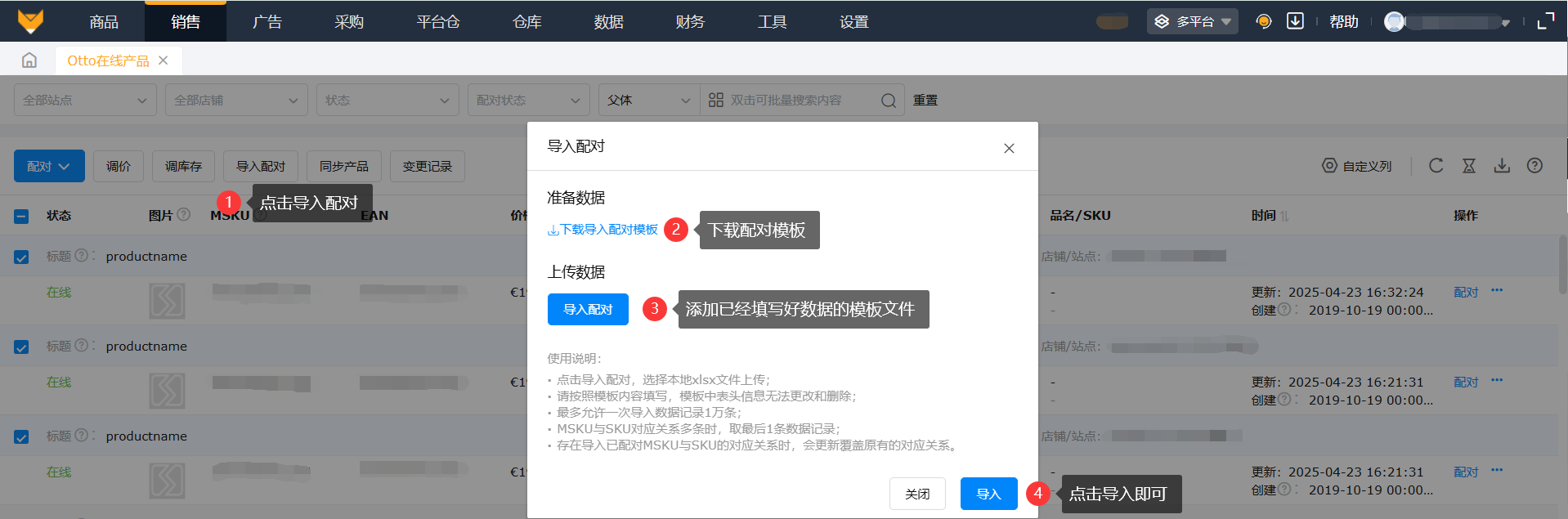 点击导入配对,下载导入配对模板,填写模板信息,上传模板文件,点击【导入】即可。