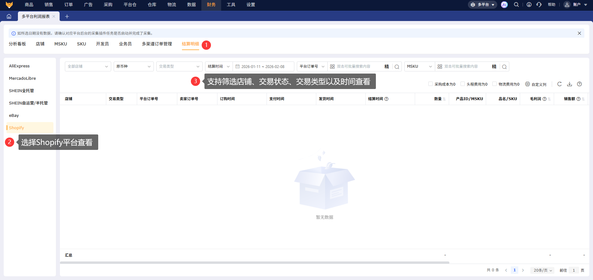 Shopify财务数据来源于订单接口,可与后台订单明细核对。获取多平台订单中有支付时间的Shopify订单数据,以支付时间当做财务利润报表的结算时间
