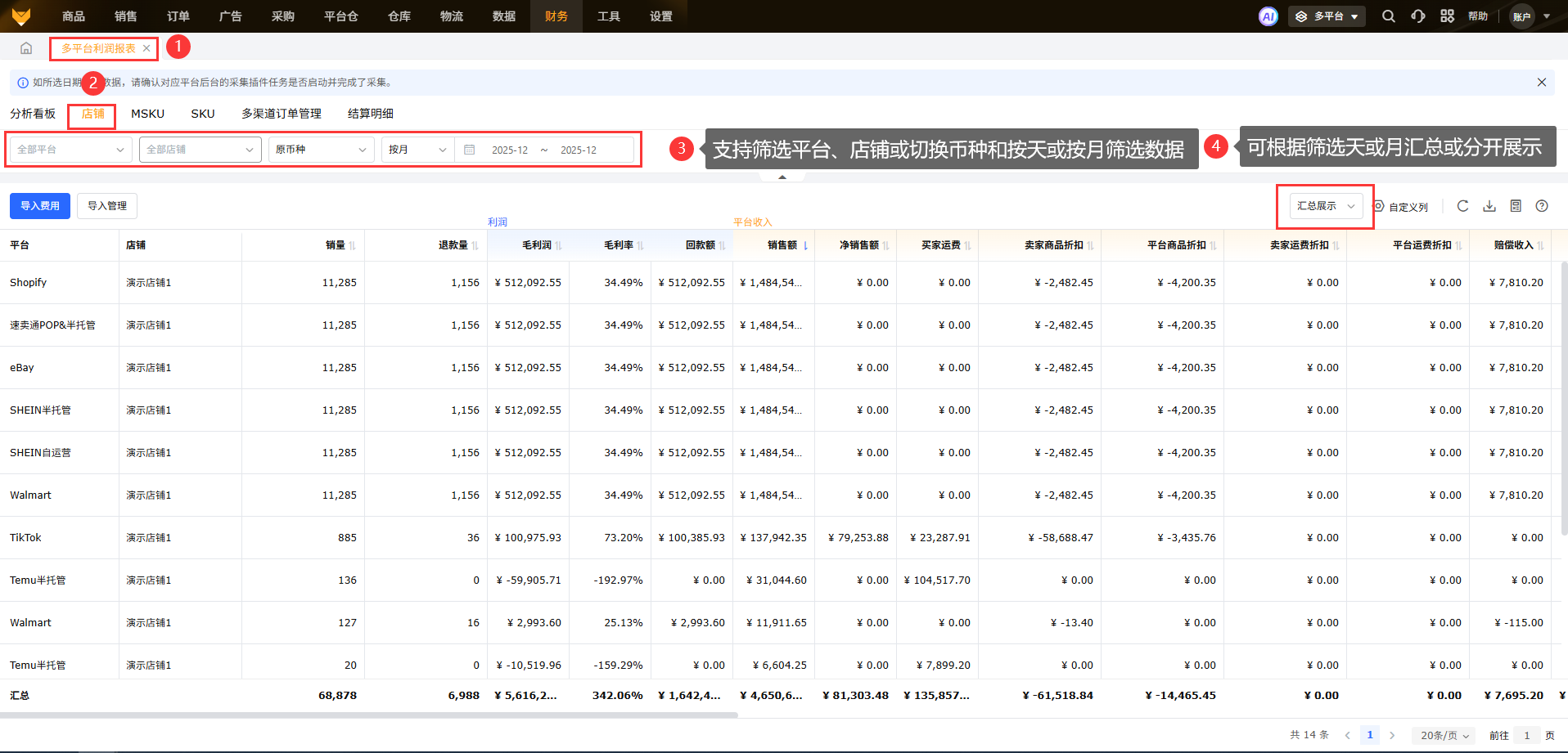 支持按天/按周/按月查看每个店铺的收支明细和毛利润,可根据筛选天或月汇总或分开展示。