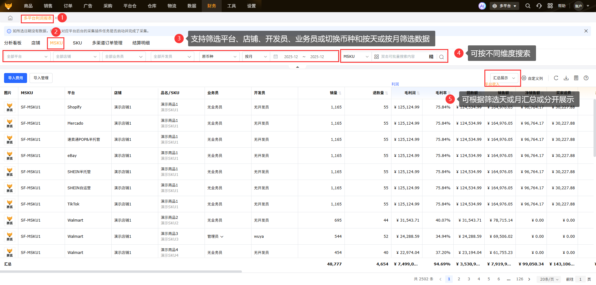 查看店铺每个SKU的收支明细和毛利润,可根据筛选天或月汇总或分开展示。