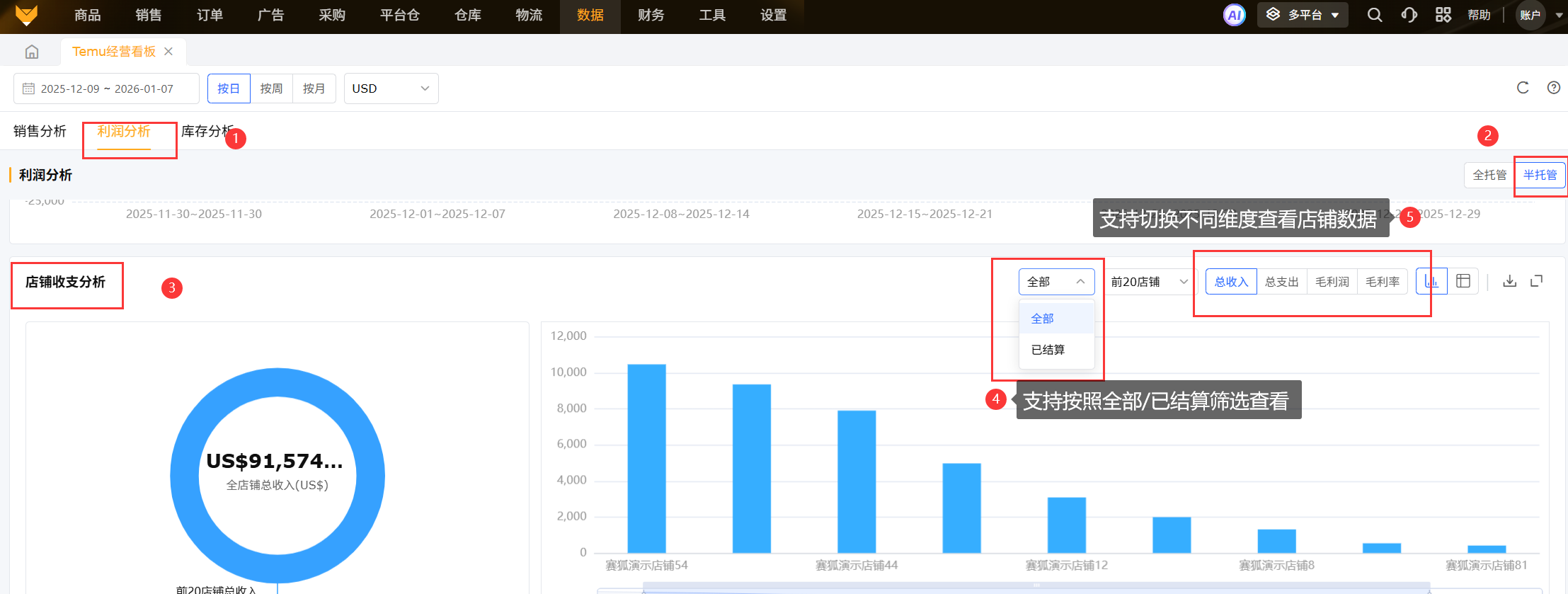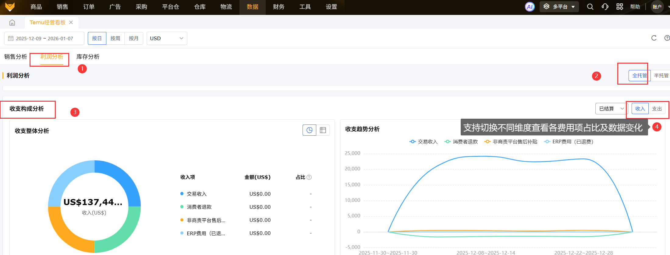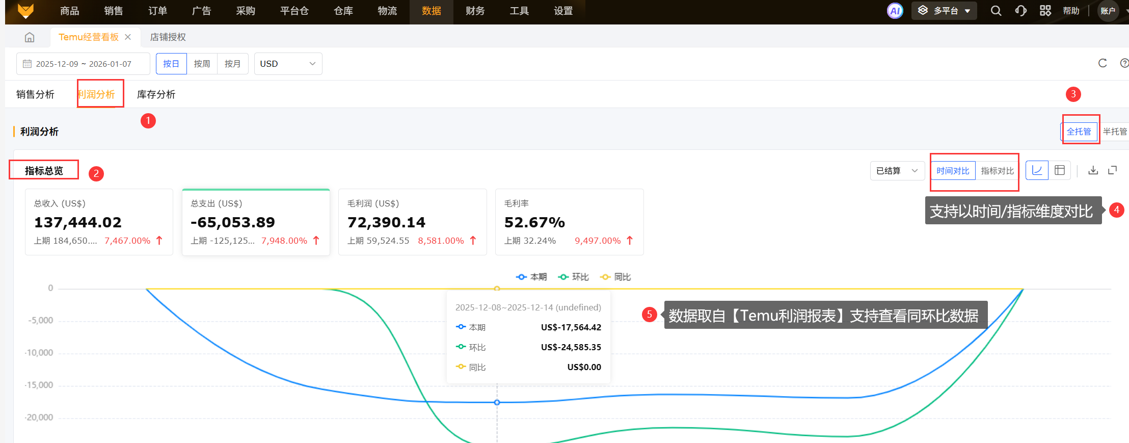 利润分析:半托管数据取自【数据】-【Temu产品分析】,全托管数据取自【财务】-【Temu利润报表】;