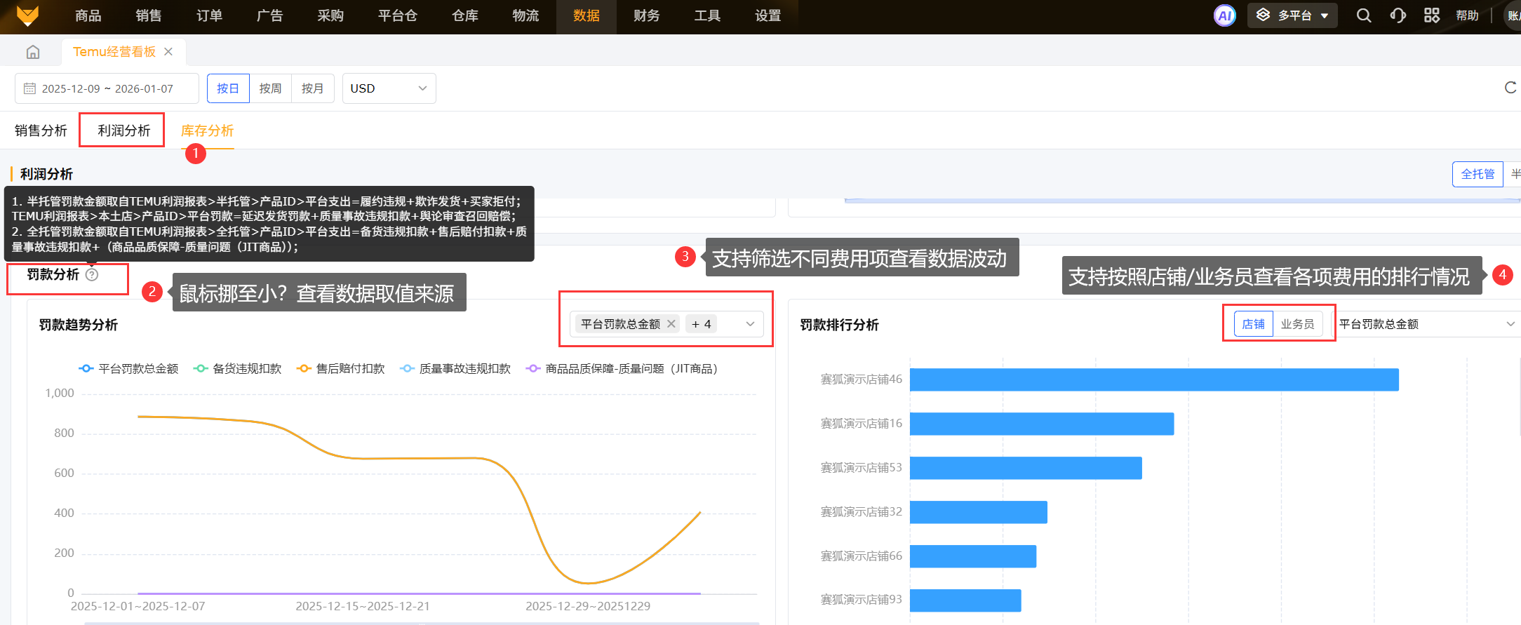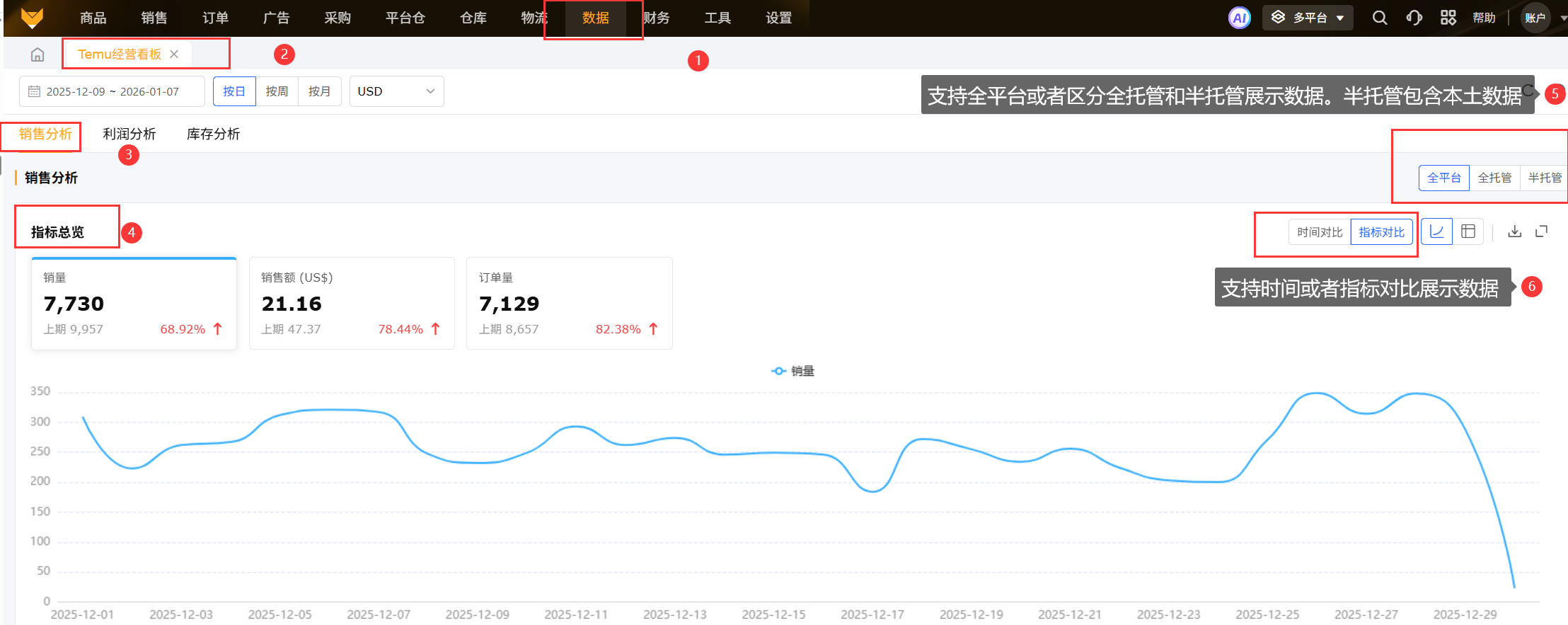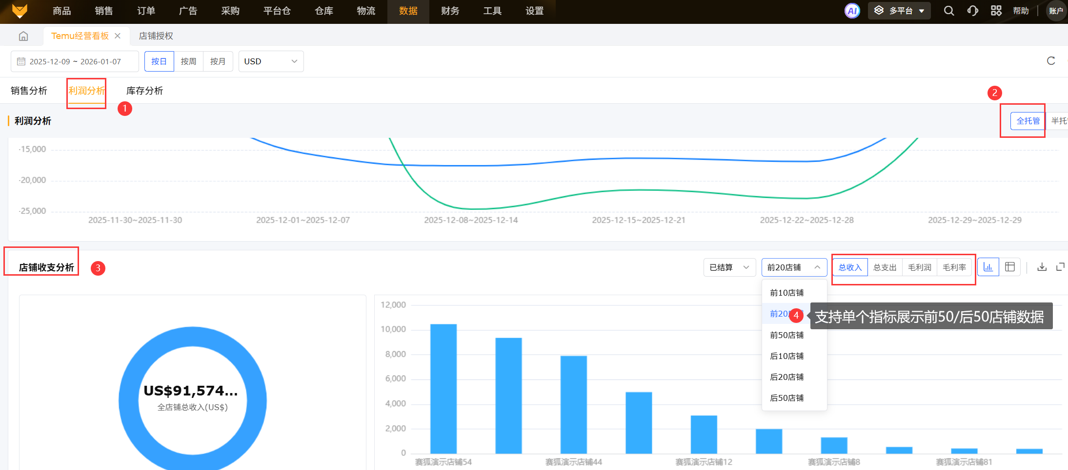 利润分析:半托管数据取自【数据】-【Temu产品分析】,全托管数据取自【财务】-【Temu利润报表】;