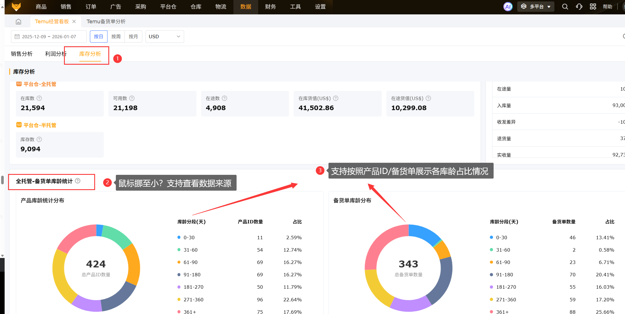 全托管-备货单库龄统计:取自【数据】-【Temu备货单分析】仅统计备货单状态为已入库且剩余库存>0的备货单数据;