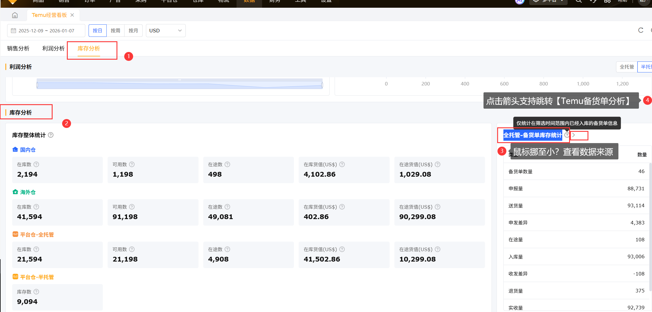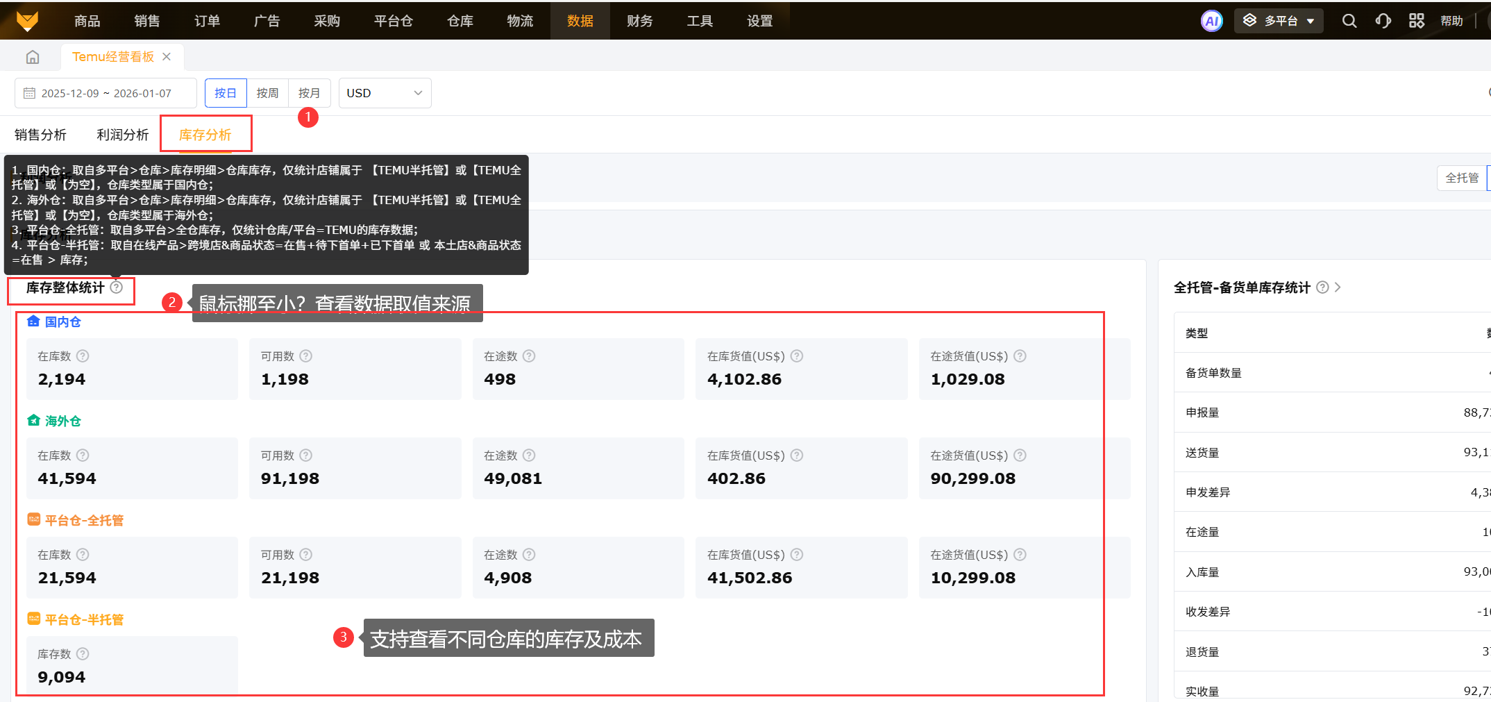 库存分析: 国内仓:取自【仓库】-【库存明细】,仅统计店铺属于 【Temu半托管】或【Temu全托管】或【为空】,仓库类型属于国内仓;