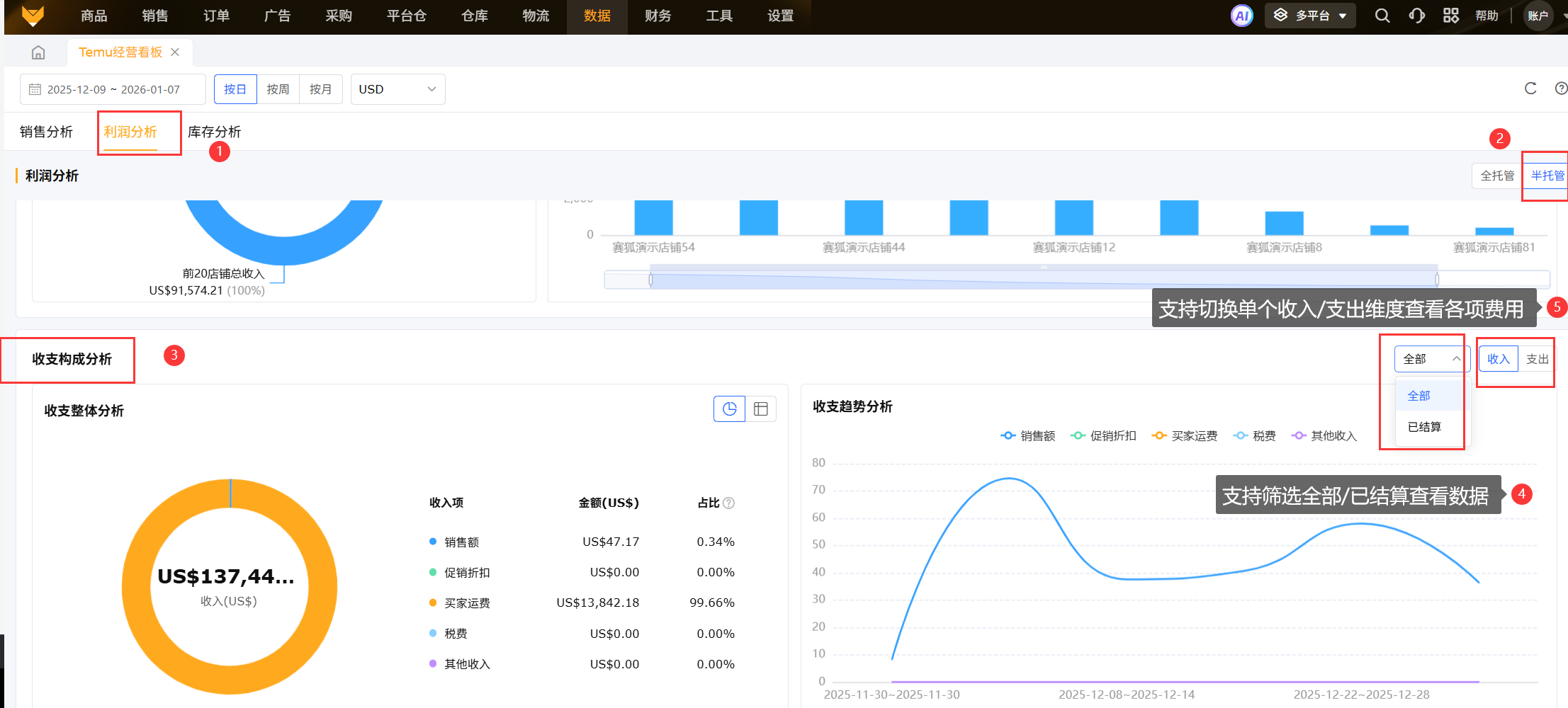全托管数据取自【Temu利润报表】展示收入/支出不同维度的各项费用占比及数据变化
