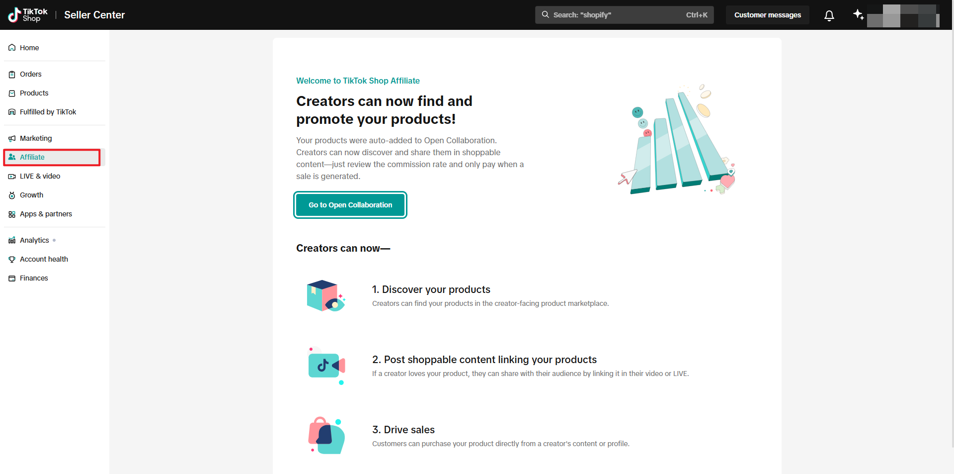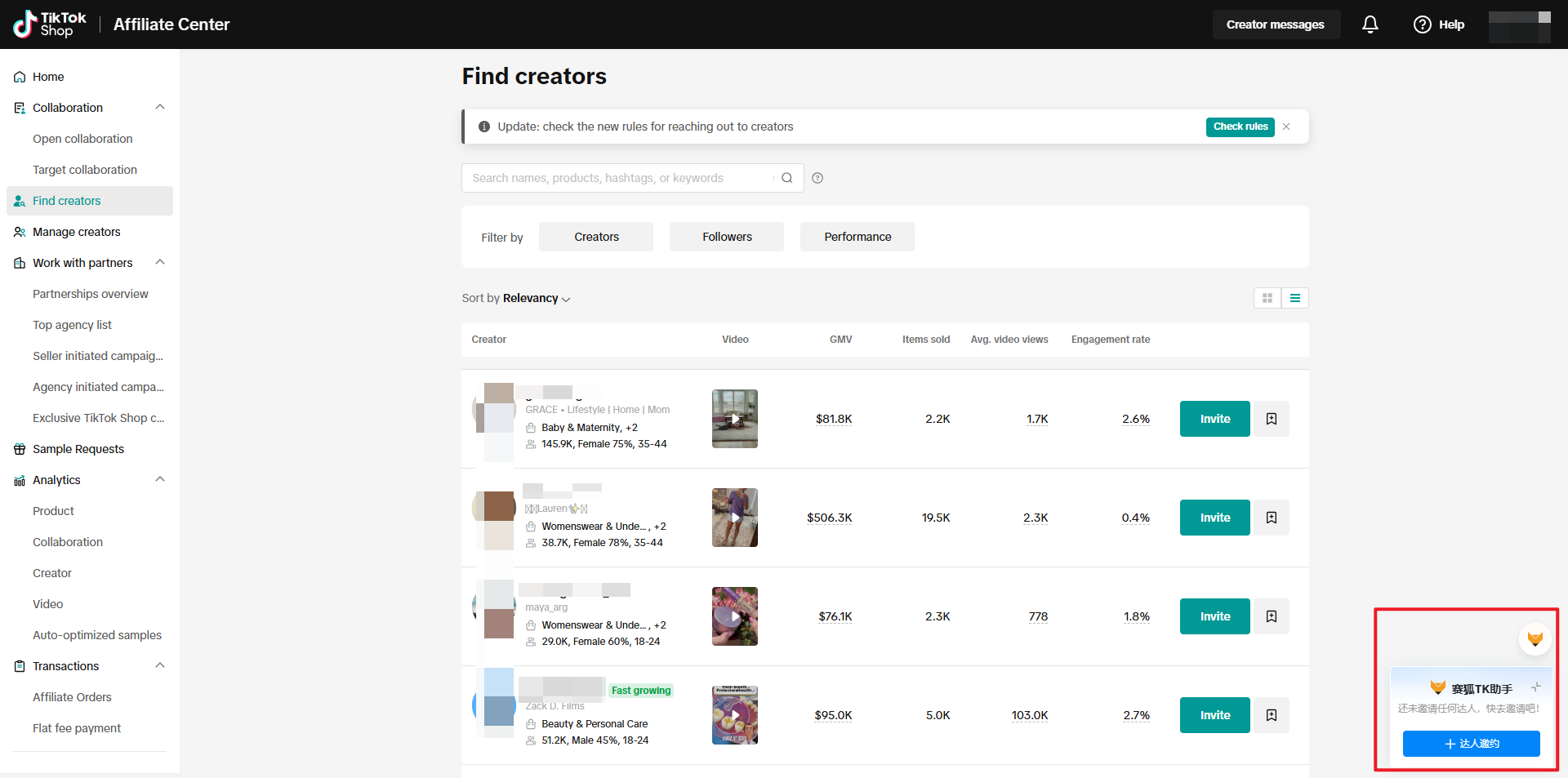 在TikTok后台,进入“Affiliate”>"Find creators"页面,点击页面右下角“赛狐TK助手”的“达人邀约”,即可打开"Creators"页面;