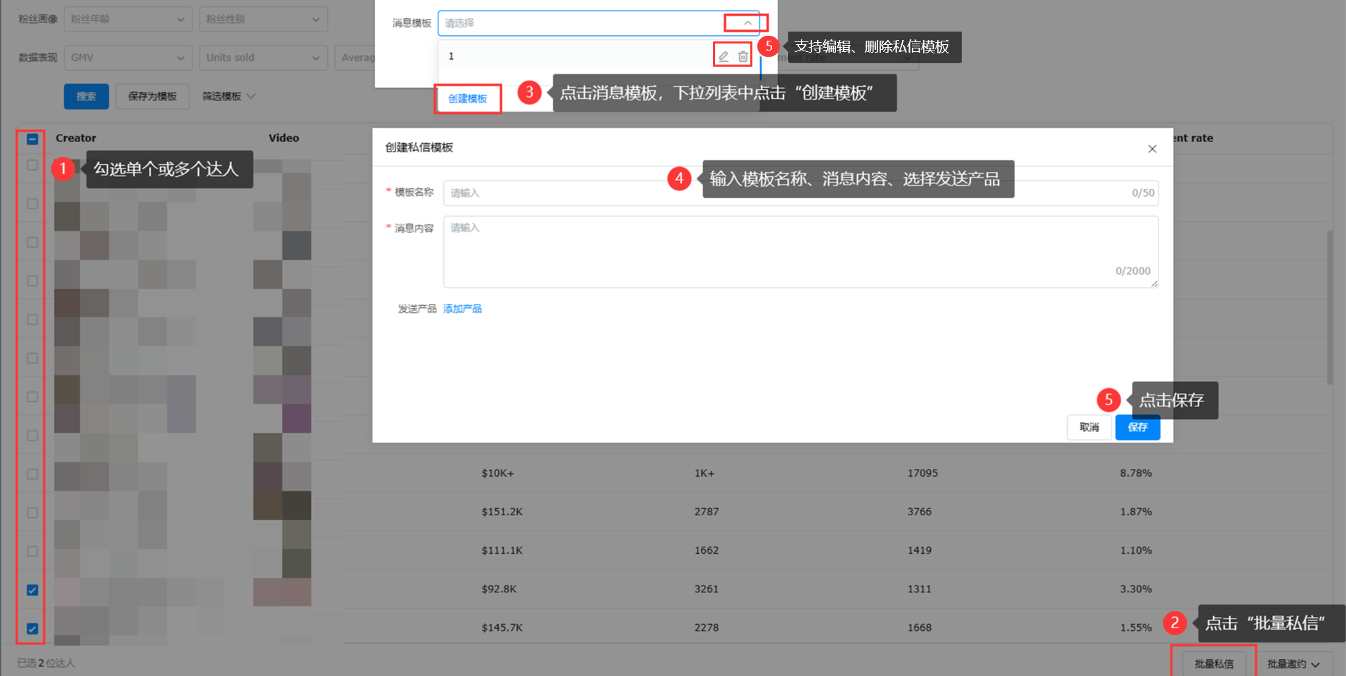 创建私信模板:勾选单个或多个达人,点击“批量私信”,下拉打开消息模板,点击“创建模板”,输入模板名称、消息内容,添加发送产品(只能添加1个),点击保存即可;