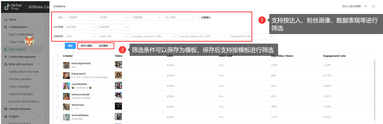 批量邀约达人:勾选单个/多个达人,点击"批量邀约",点击邀约模板即可完成批量邀约;