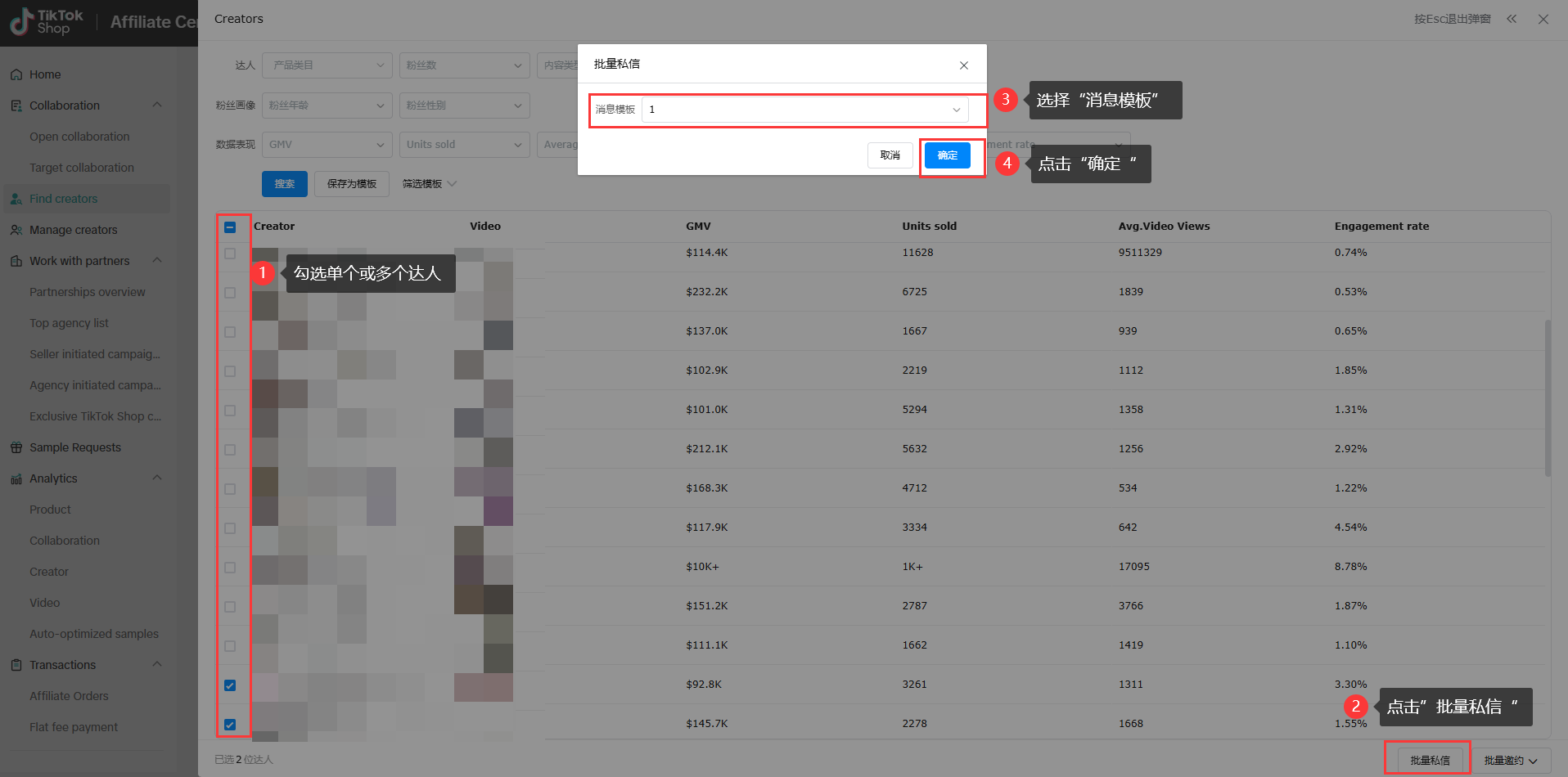 批量私信达人操作步骤:勾选单位或多位达人,点击“批量私信”,下拉选择消息模板,点击确定即可。