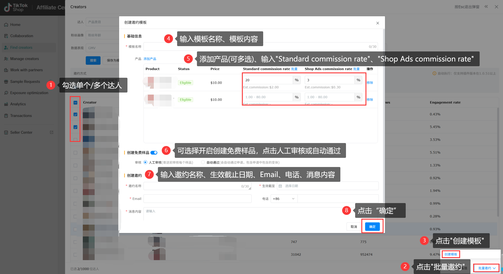 创建邀约模板:勾选单个/多个达人,点击"批量邀约",点击"创建模板",输入模板名称、模板内容,添加产品(可多选)、输入"Standard commission rate"、"Shop Ads commission rate"(广告佣金),可选择开启创建免费样品,点击人工审核或自动通过,输入邀约名称、生效截止日期、Email、电话、消息内容,点击"确定";