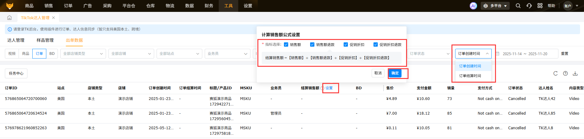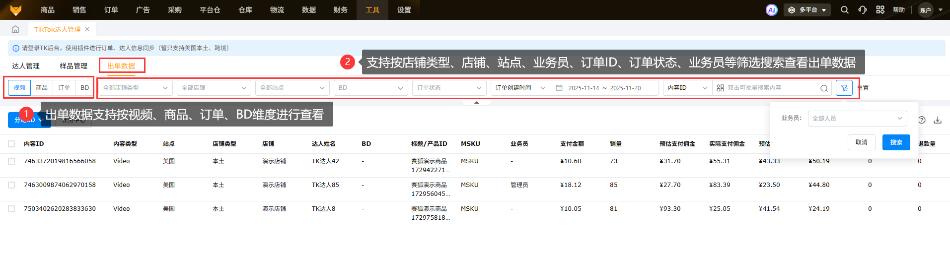 支持按店铺类型、店铺、站点、BD、业务员、订单ID、订单状态等筛选搜索查看出单数据;