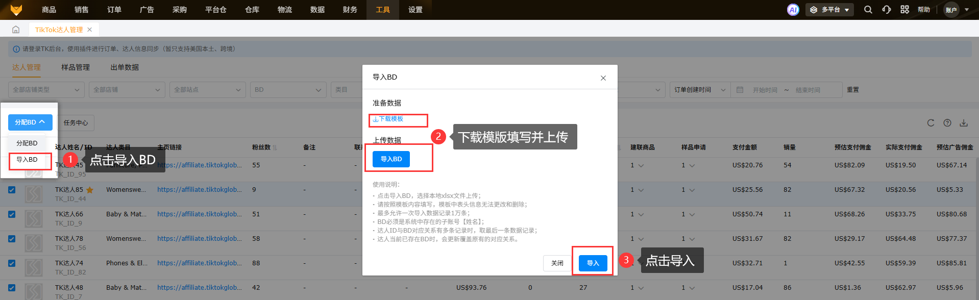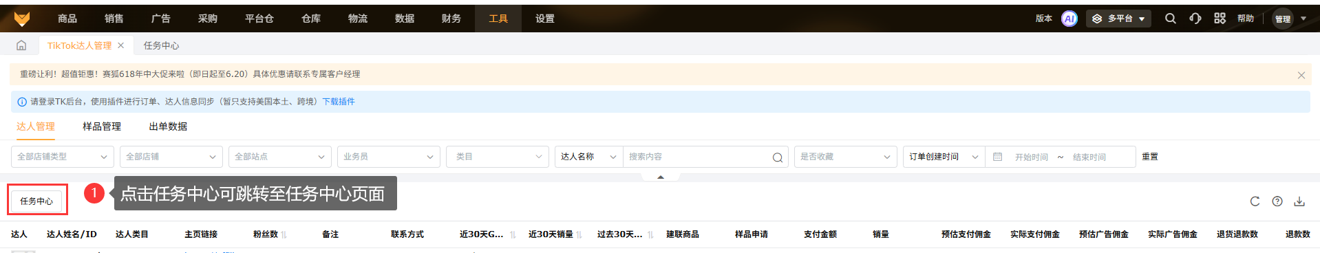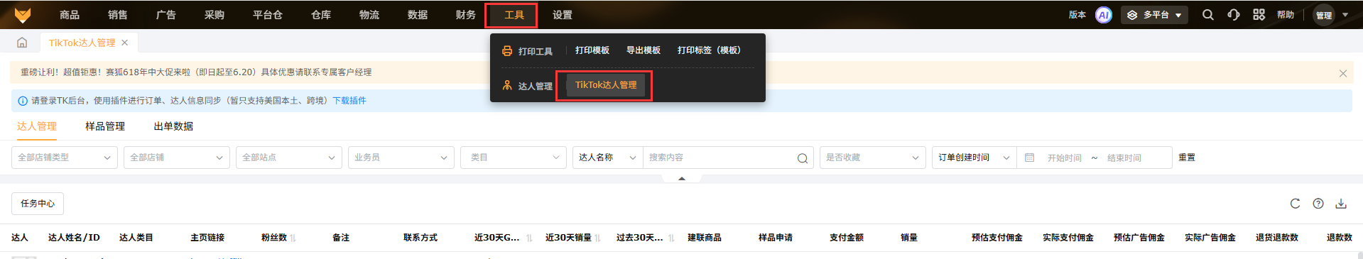 入口1:在【多平台】模式进入【工具】-【TikTok达人管理】。