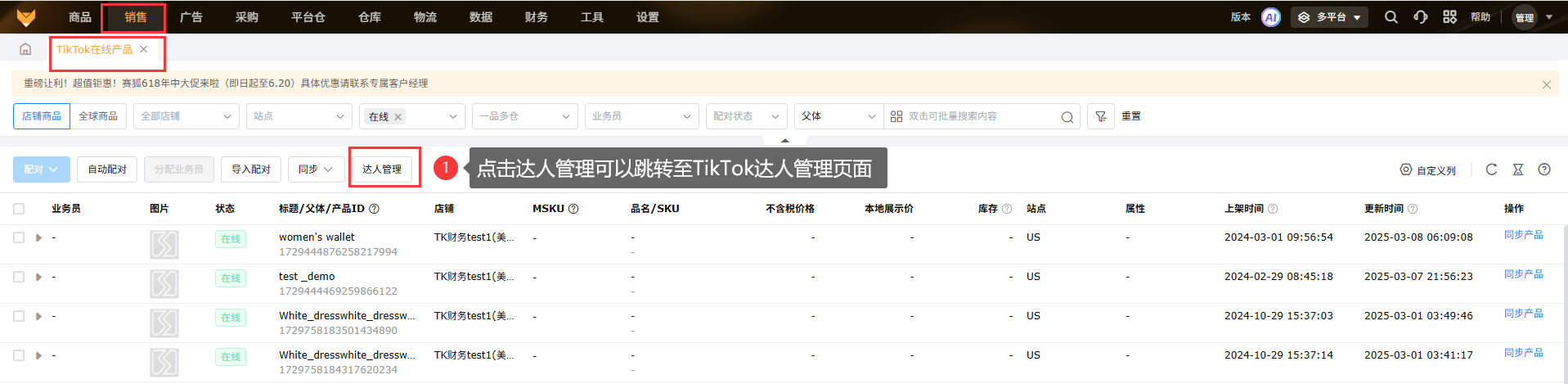 入口2:在【多平台】模式进入【销售】-【TikTok在线产品】,点击页面左上角的“达人管理”即可进行跳转。