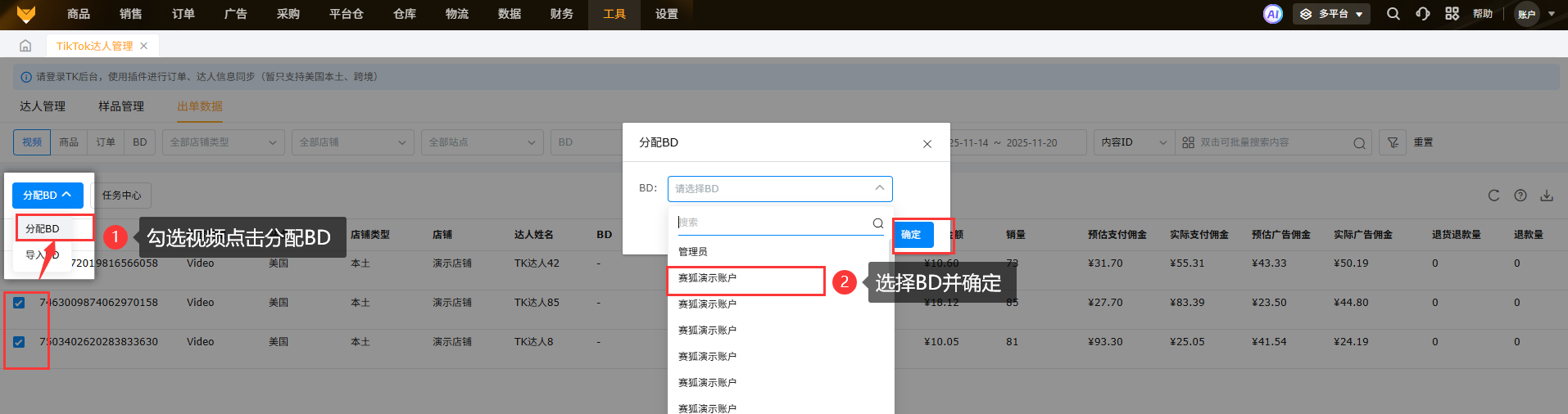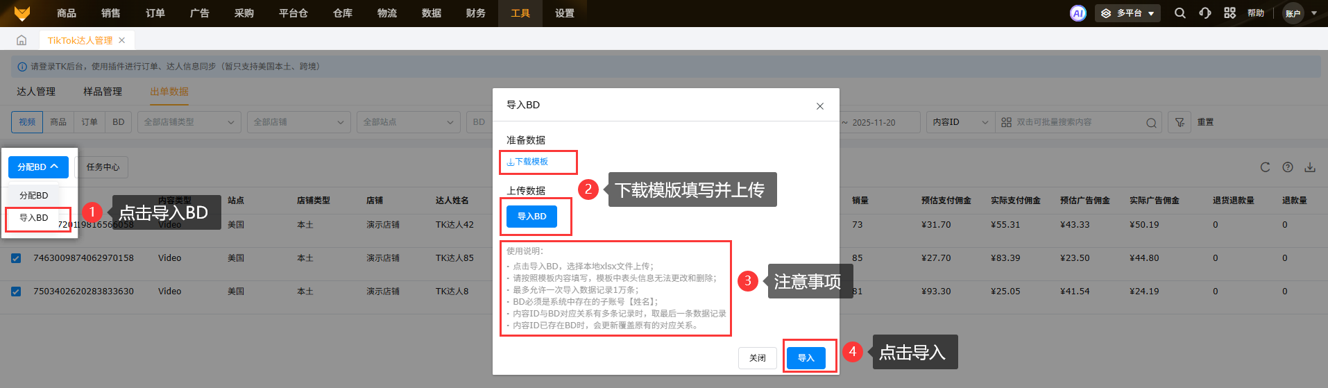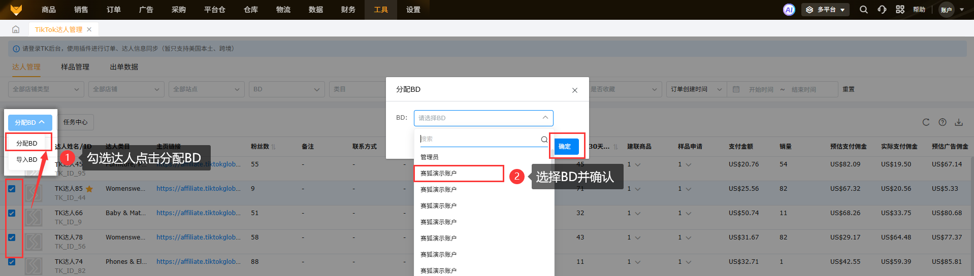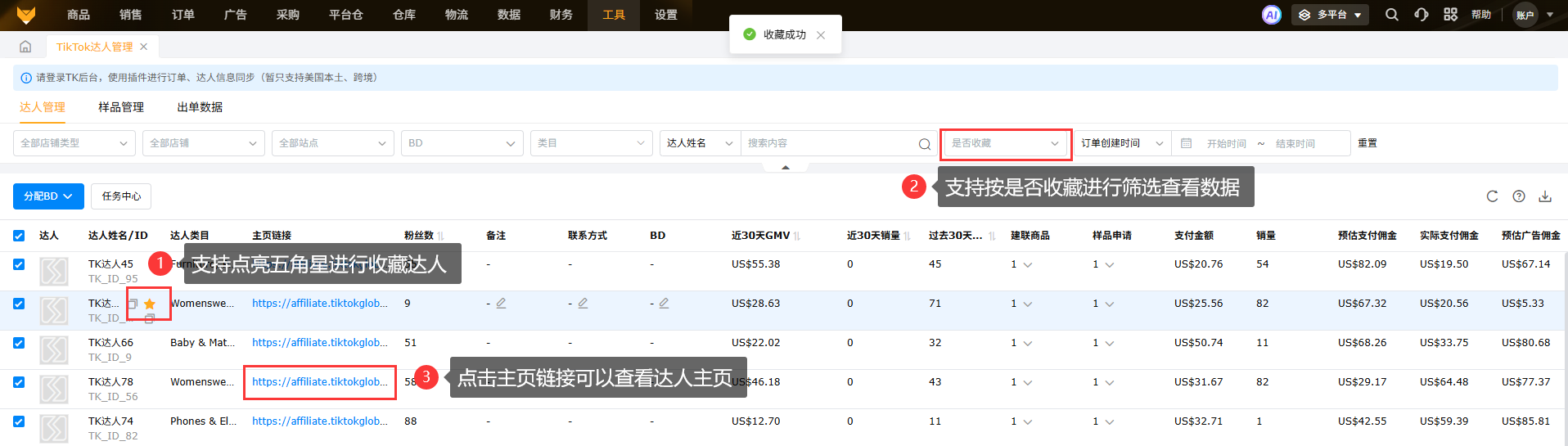 支持按店铺类型、店铺、站点、BD、类目、达人名称等进行筛选搜索查看达人数据;