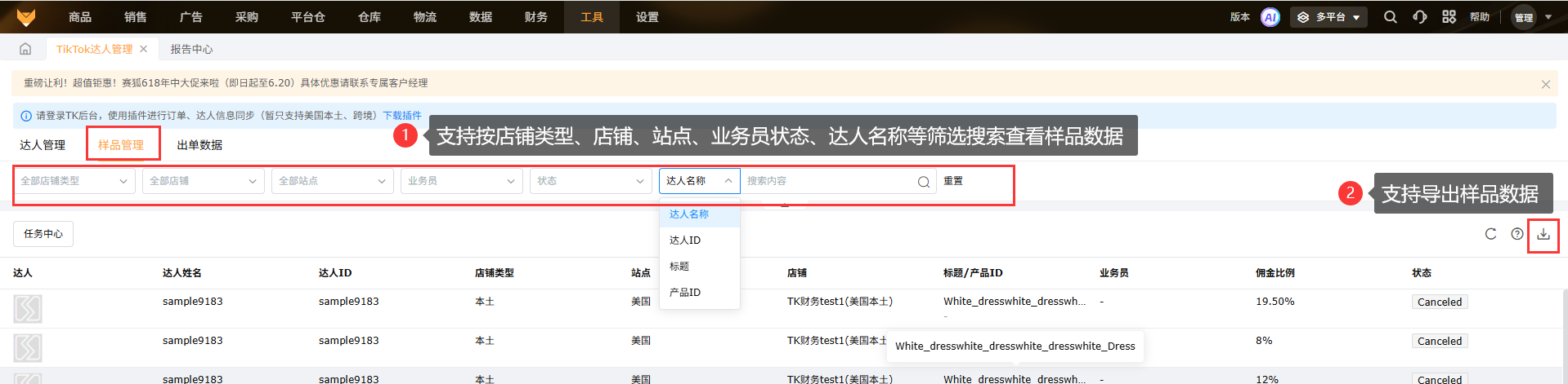 支持按店铺类型、店铺、站点、业务员状态、达人名称等筛选搜索查看样品数据;