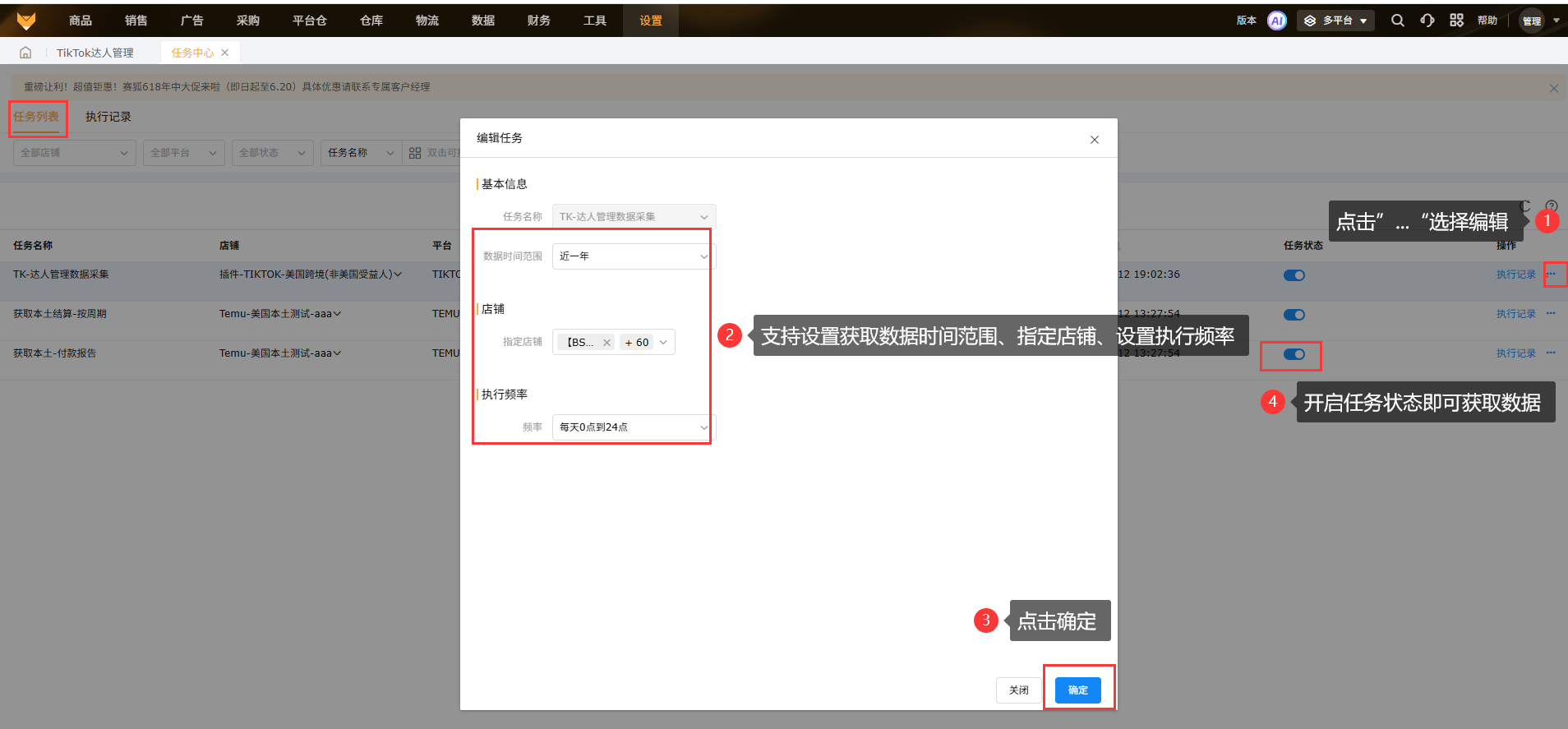 点击任务中心-任务列表-编辑开启任务后,会按设置的店铺和执行频率进行获取数据;