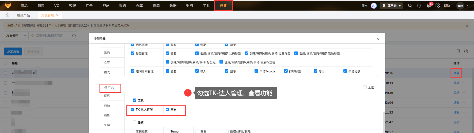 在【设置】-【角色管理】-【工具】页面勾选达人管理功能。