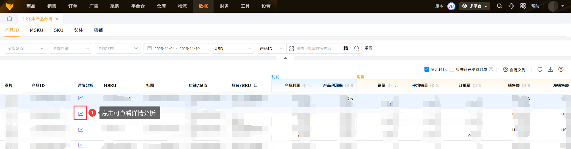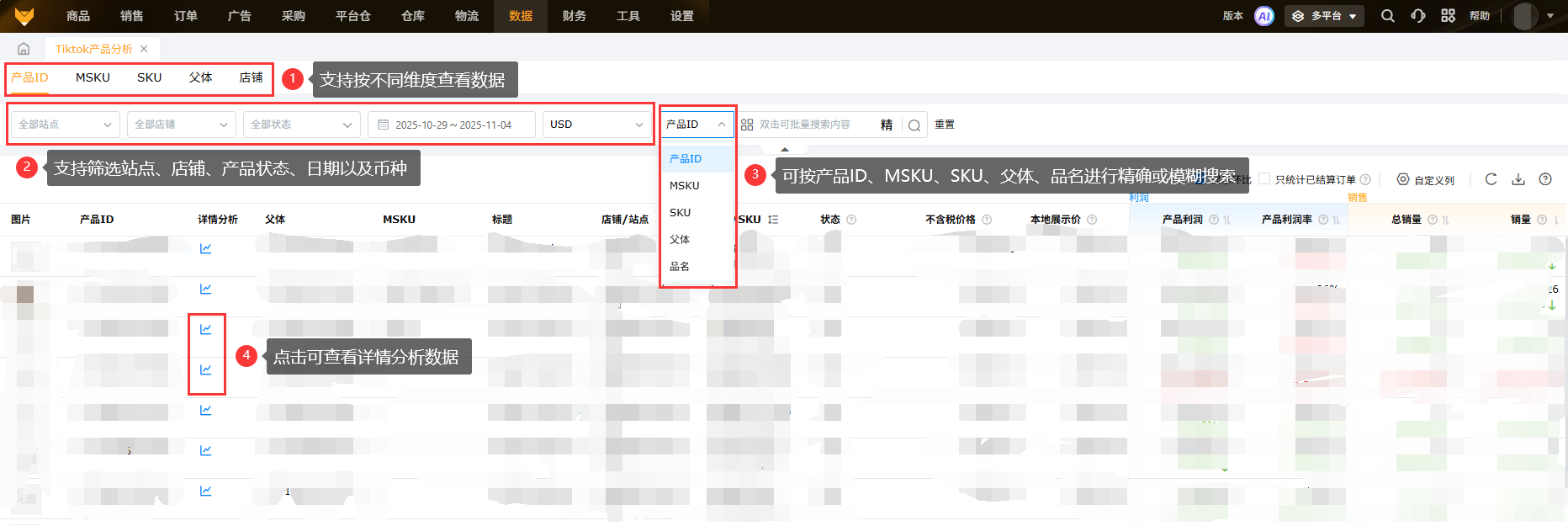 2.1支持按产品ID、MSKU、SKU、父体、店铺维度查看数据