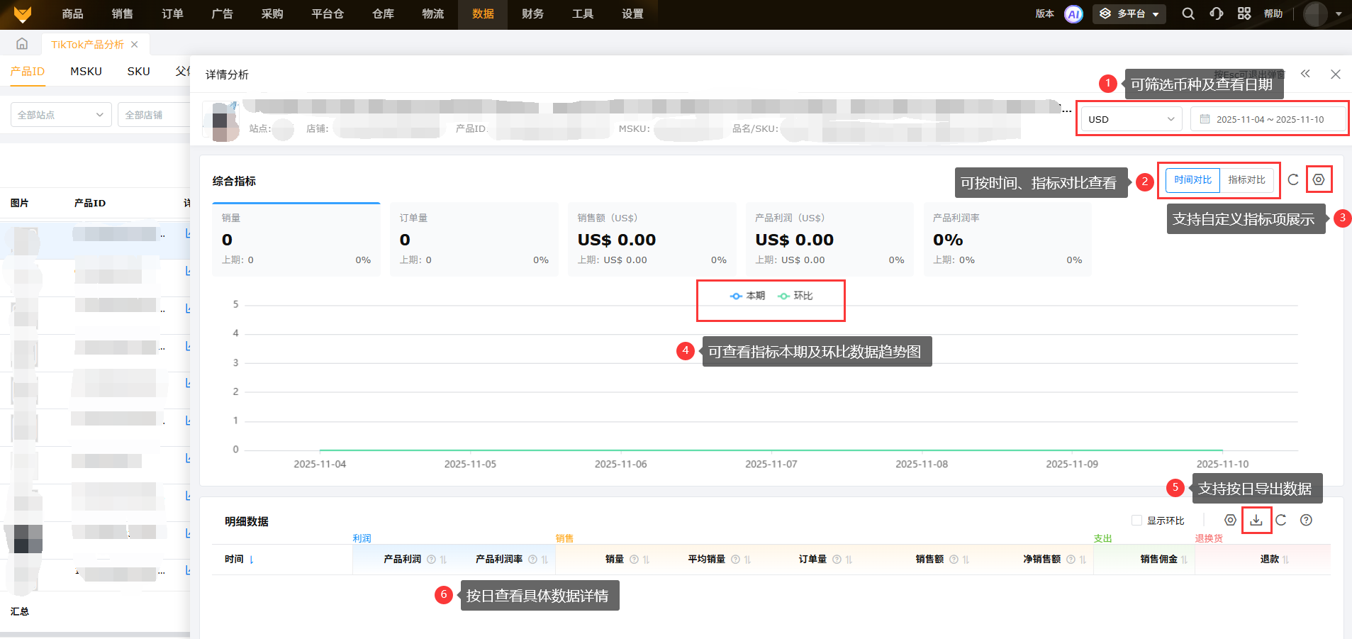 可跨店铺分析TikTok产品销售、利润、库存等数据。