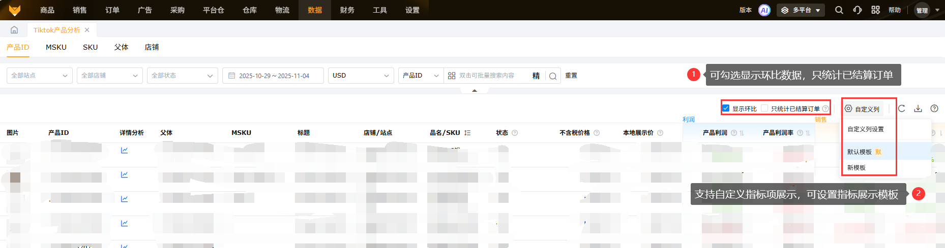 2.2支持显示环比数据、只统计已结算订单,可自定义指标项展示