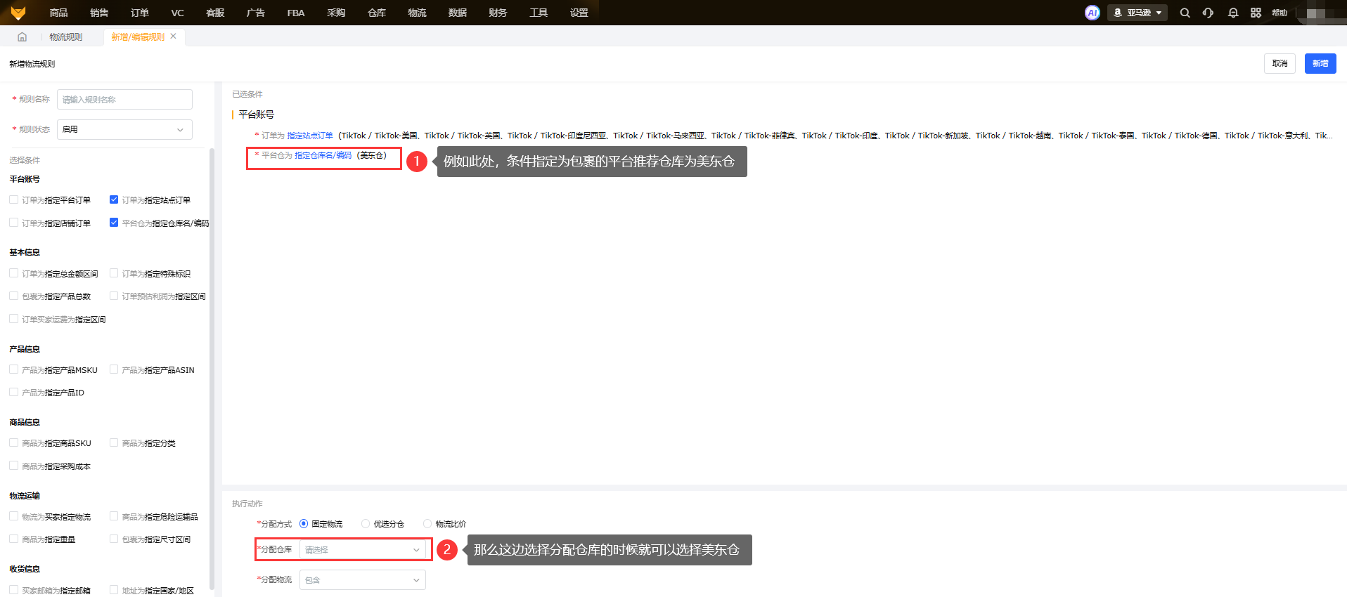 流程大体和其他平台一致,选择需要满足的条件进行设置规则,满足规则自动执行分配指定的仓库和渠道或者自动物流下单。但是!!!TK有平台推荐仓库的特殊情况,所以在规则条件中可以用“订单指定站点订单”和“平台仓为指定仓库名/编码”两个条件来对有平台推荐仓库的TK包裹进行自动分配仓库,站点限制为TK的站点,仓库/编码限制为指定的平台推荐仓库/编码(注意这边条件只能指定平台推荐仓库,平台推荐物流不支持)