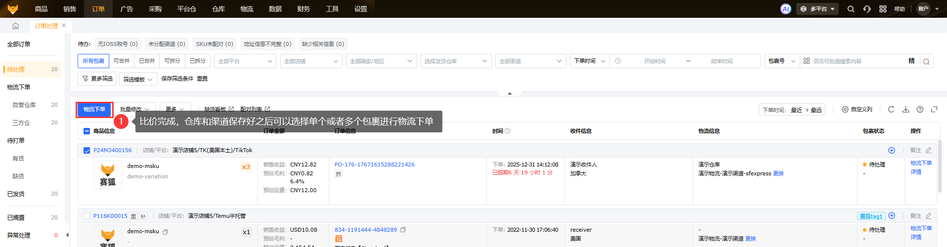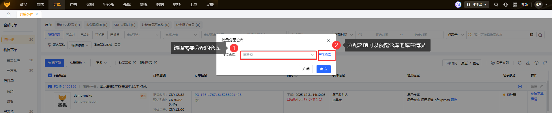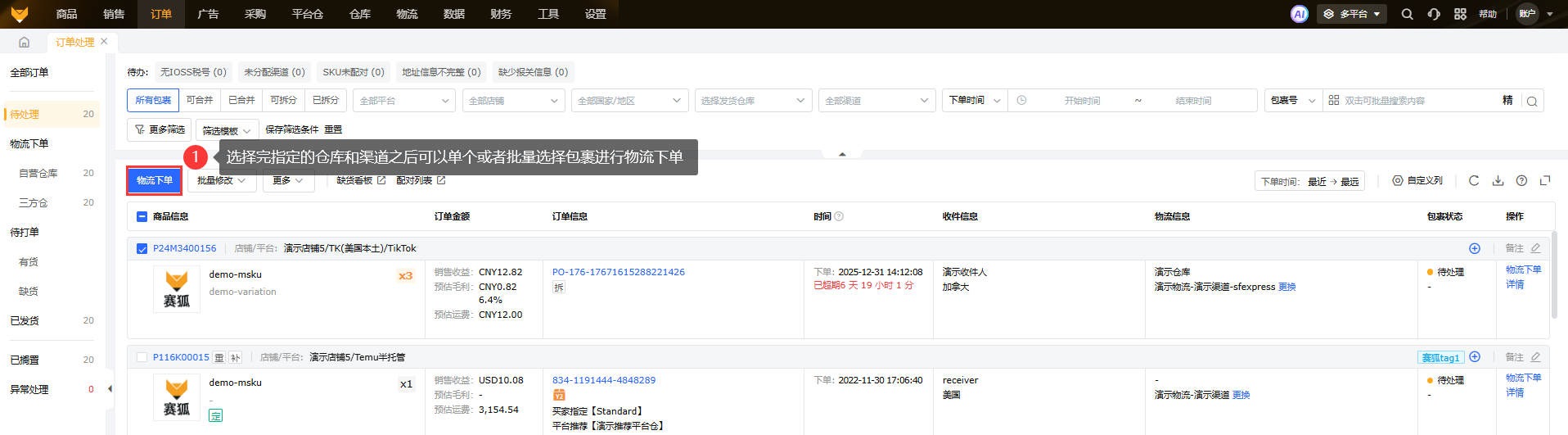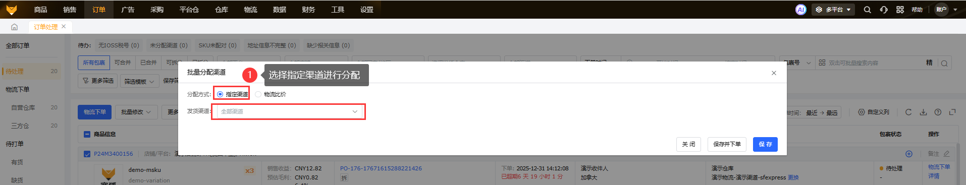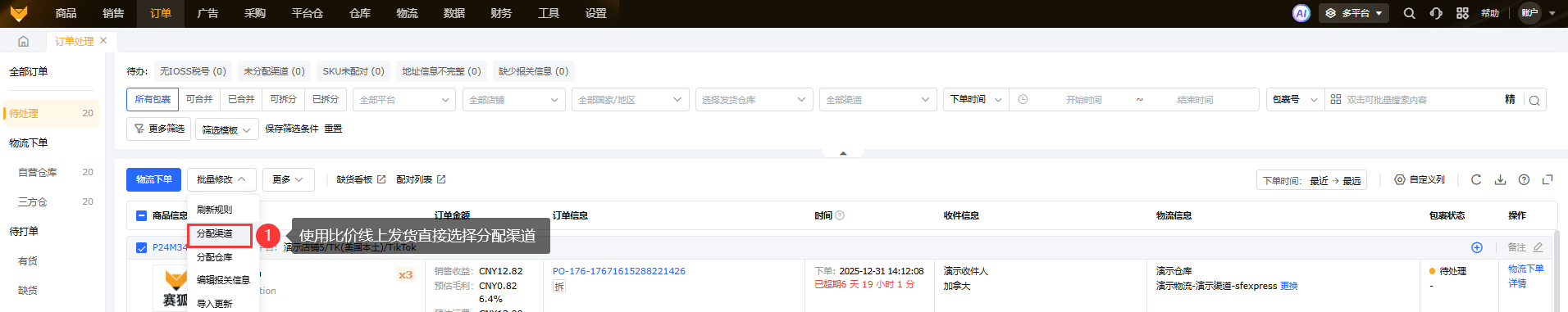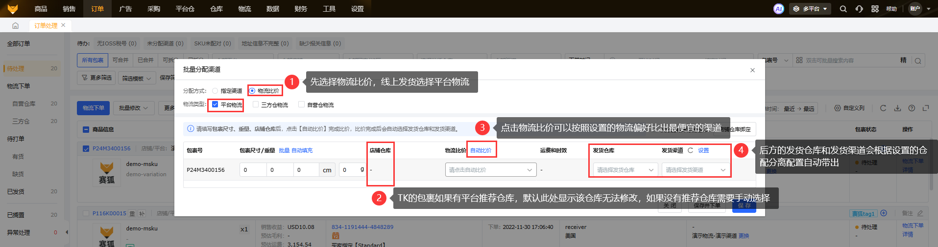 ①在待处理中,可以选中单个或者多个包裹,选择批量修改,先选择指定的仓库,然后选择指定分配的渠道