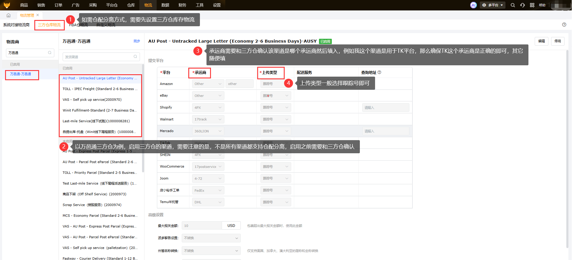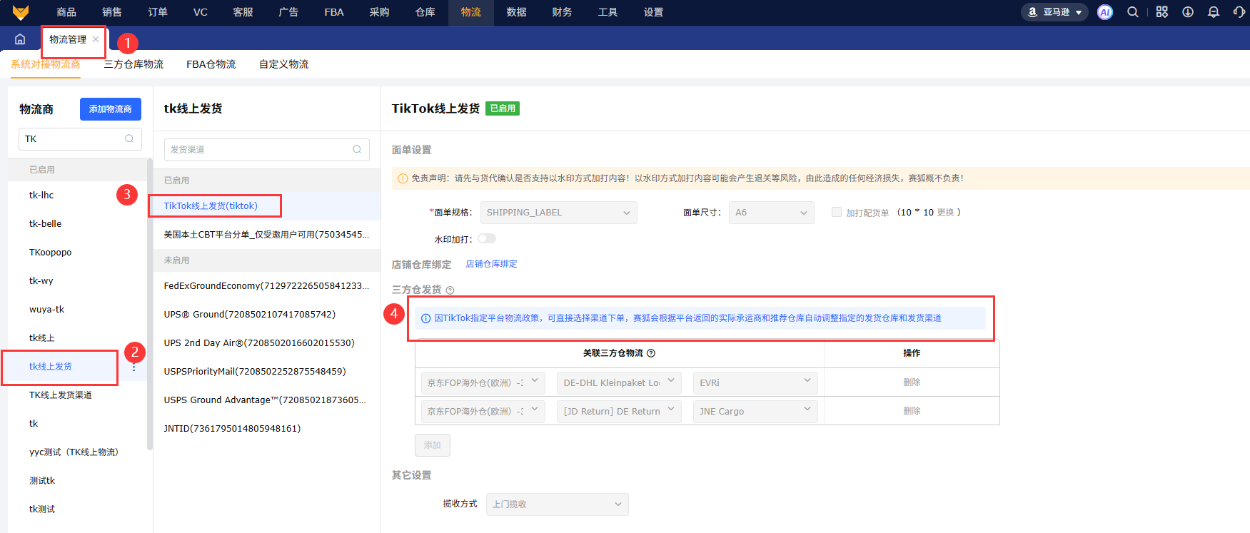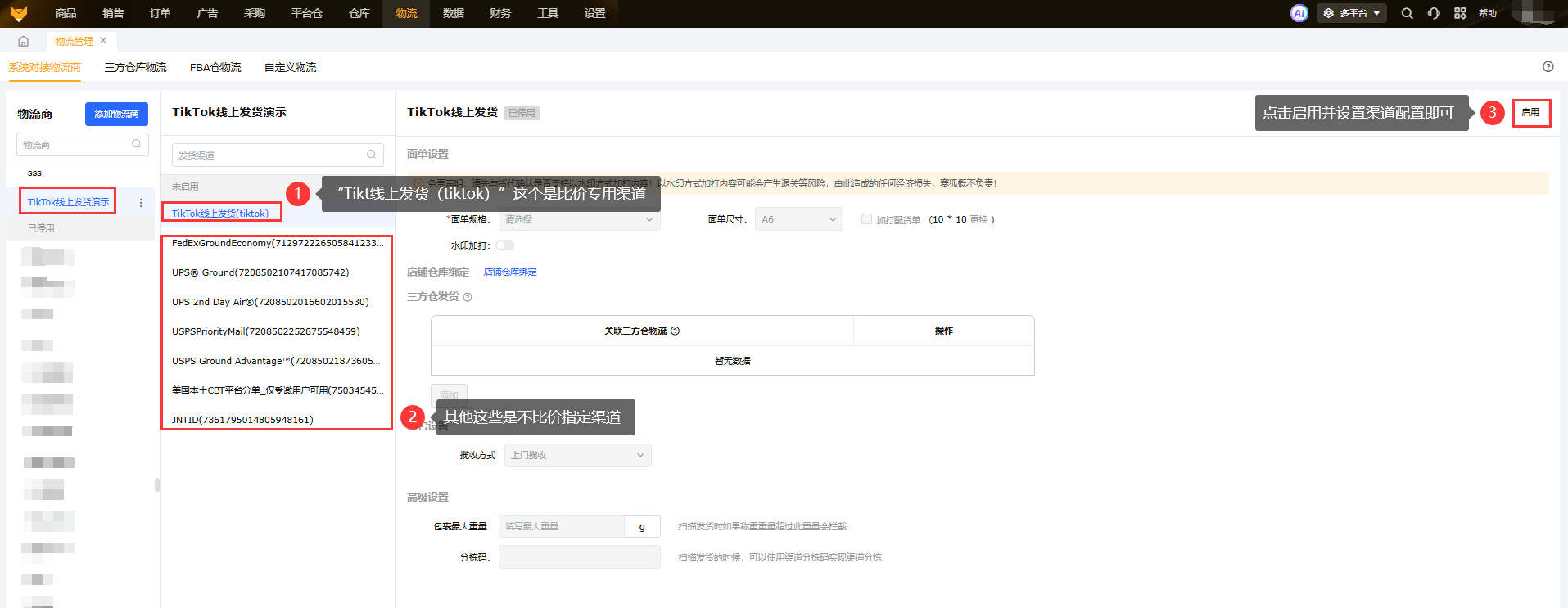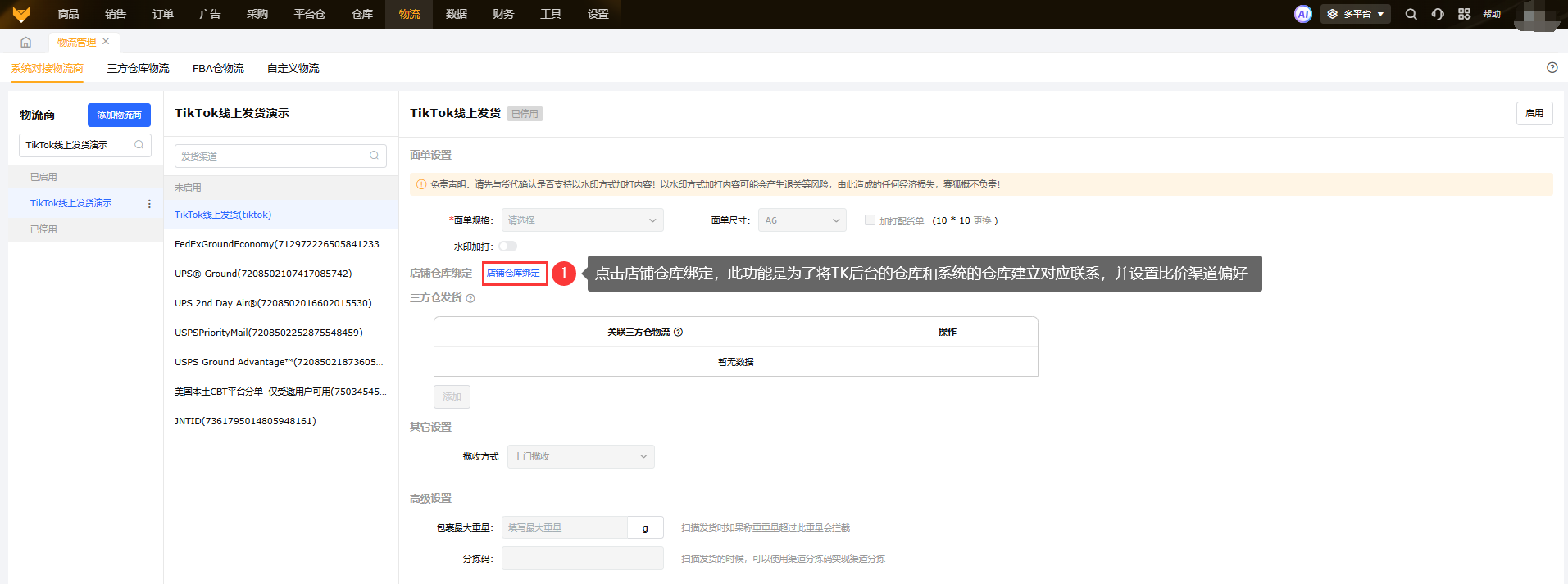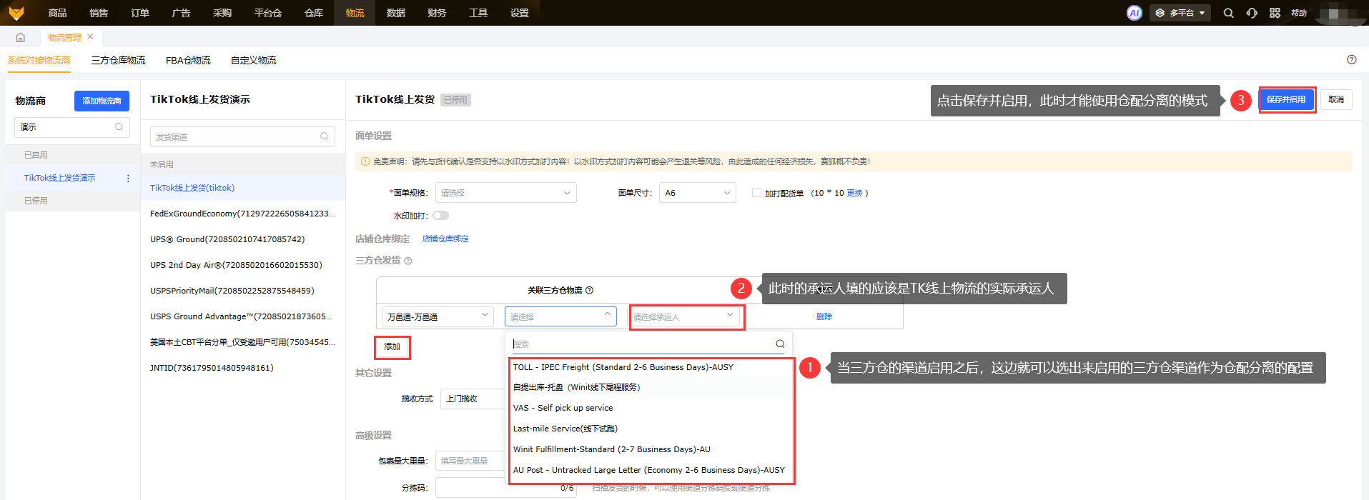 ②使用仓配分离模式(TK线上面单,三方仓出库),还需要先启用三方仓对应的支持仓配分离的渠道,再完成仓配分离配置