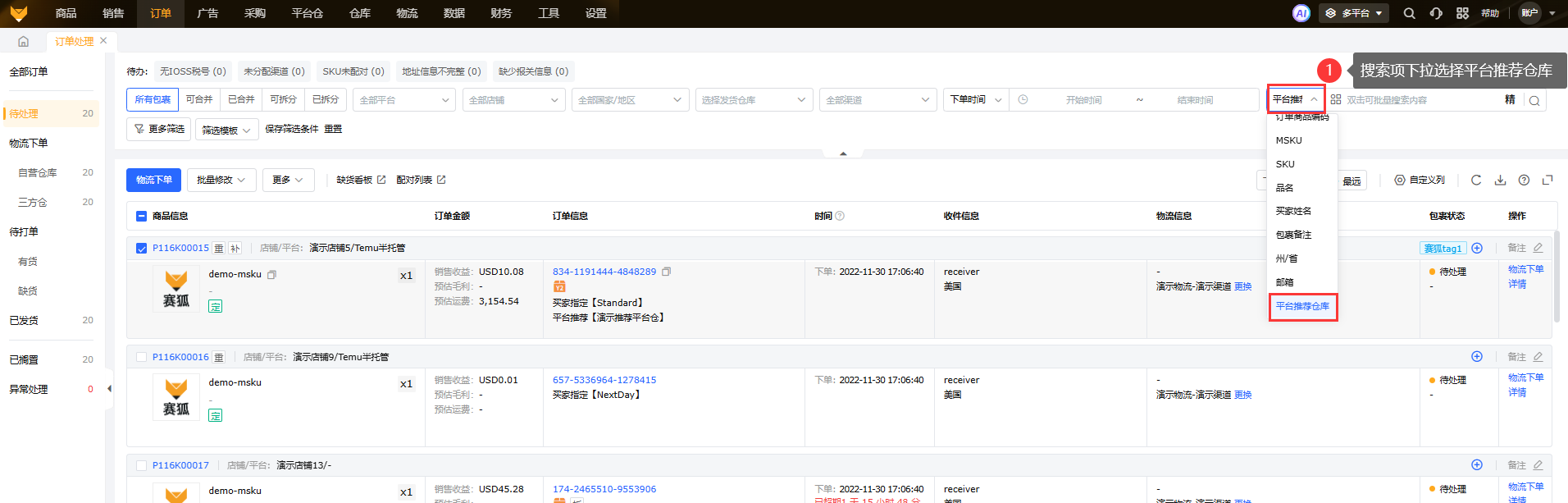 A1:包裹列表支持搜索平台推荐仓库,如图所示: