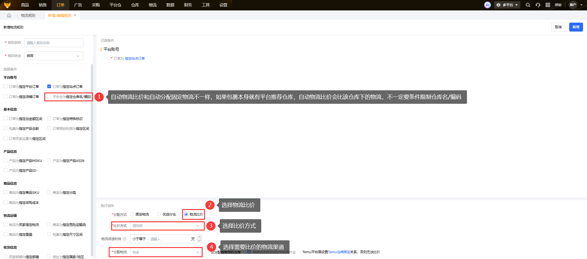 使用订单规则的物流比价,需要设置比价方式(选运费最低物流和本区海外仓发货且运费最低物流),和选择需要比价的分配物流。需要注意的是!!!自动比价可以不需要设置条件限定平台仓为指定仓库名/编码,因为如果包裹有平台推荐仓库,那么会自动比价推荐仓库下的物流渠道