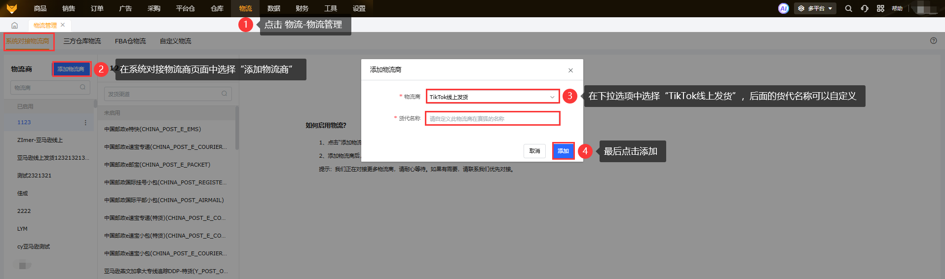 在【物流】-【物流管理】-【系统对接物流商】页面添加TikTok线上发货物流。