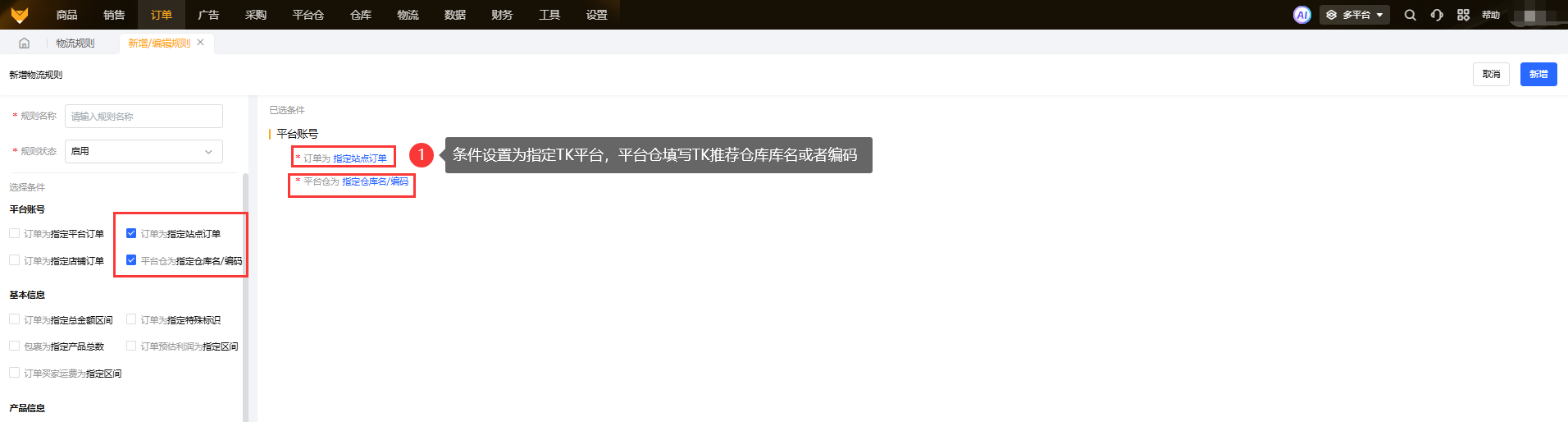 A2:对于TK平台的推荐仓库包裹可以设置规则条件指定TK站点和平台仓,如图所示: