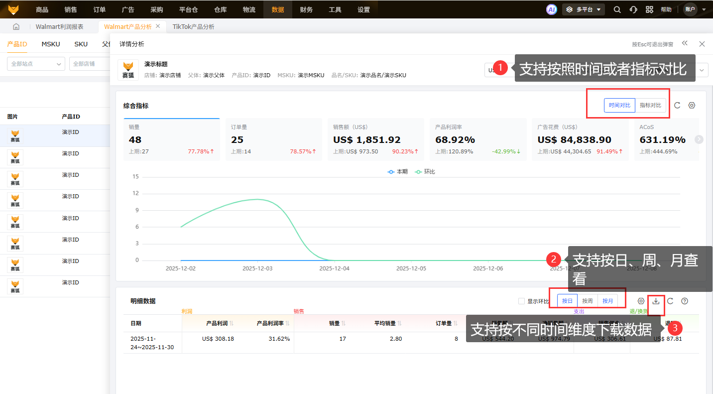 可跨店铺分析Walmart产品销售、利润、库存等数据