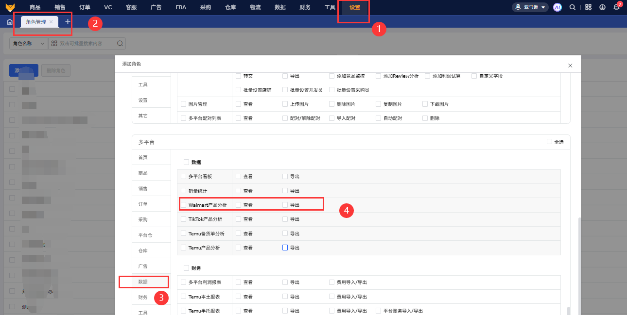 【设置】-【角色管理】-【数据】-【Walmart】勾选对应权限保存