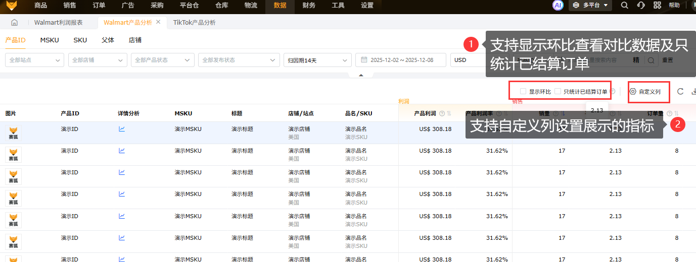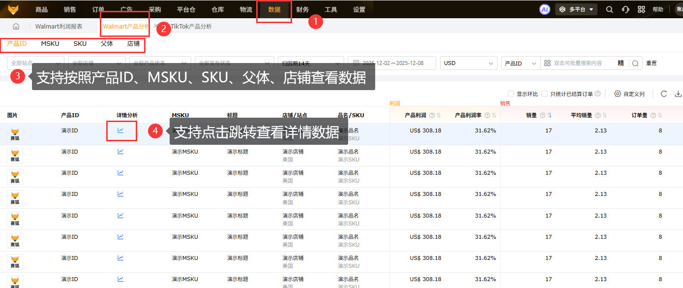 支持按照产品ID、MSKU、SKU、父体、店铺查看数据