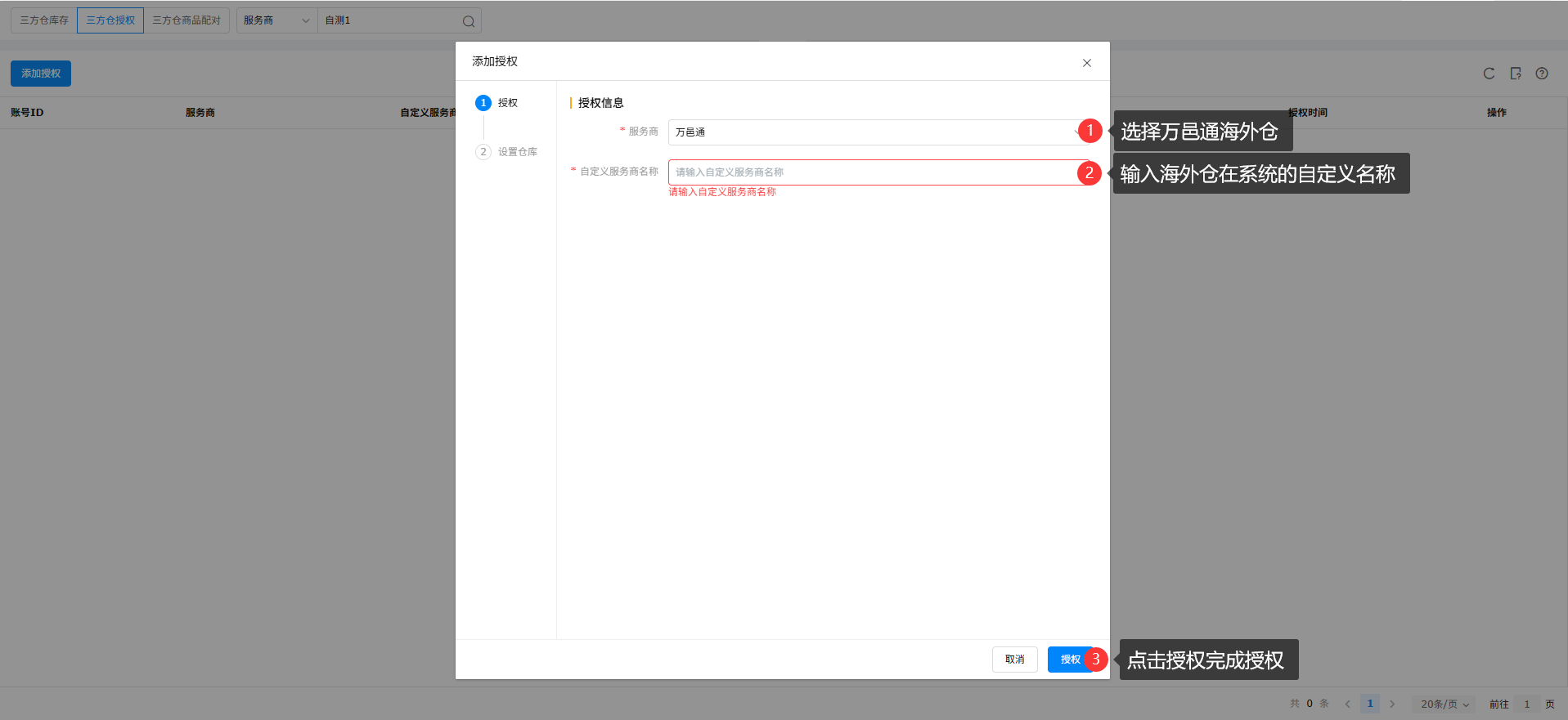 (1)在【仓库】-【三方仓库存】-【三方仓授权】页面,点击【添加授权】进行海外仓授权;